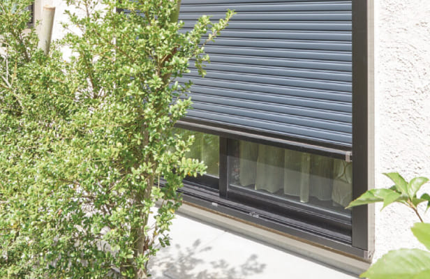 1階の掃出し窓に電動シャッターを設置。窓を閉めたまま操作できるので、快適な室内温度を損なわずに開閉可能です。