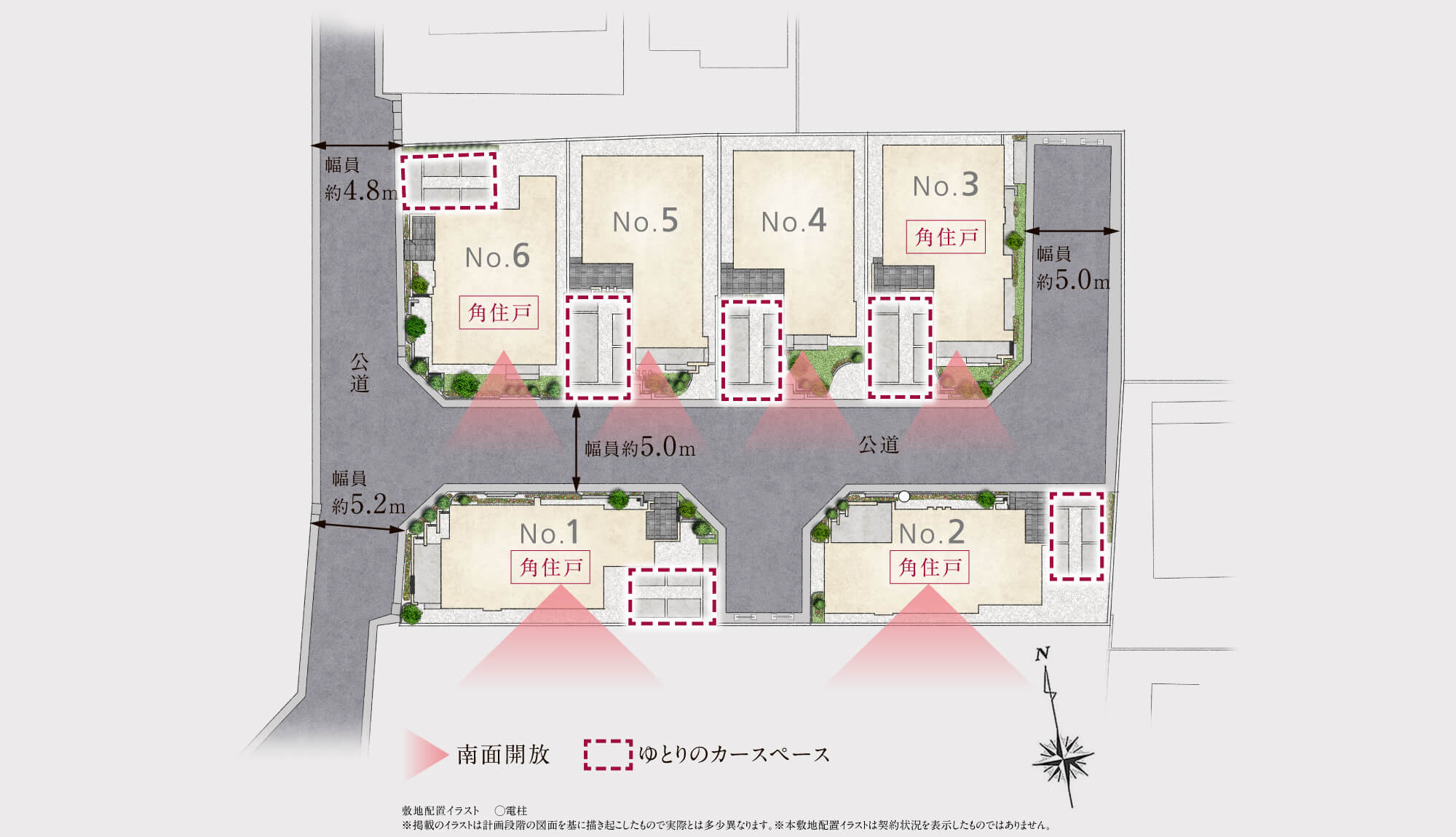 全邸南面開放×角住戸中心(6邸中4邸)。