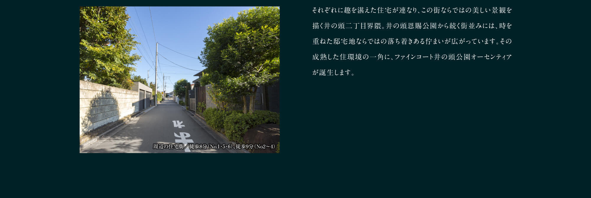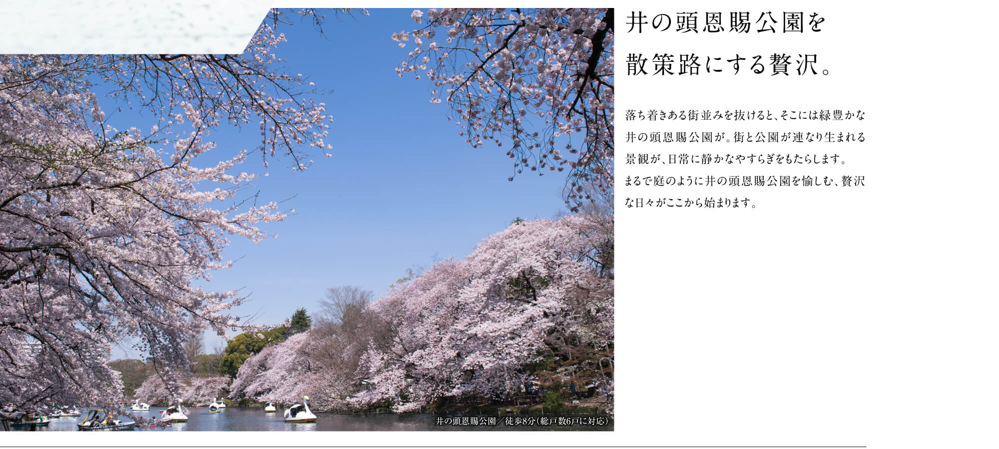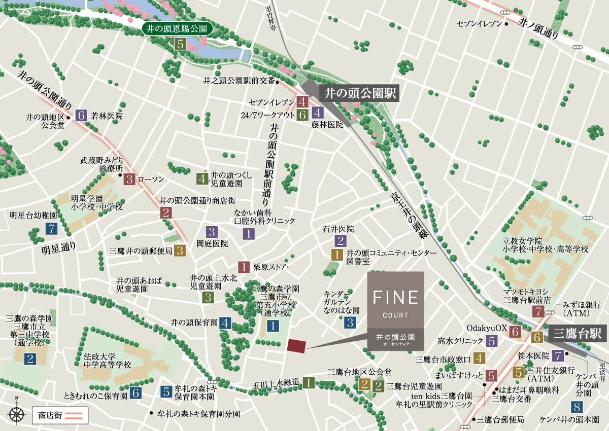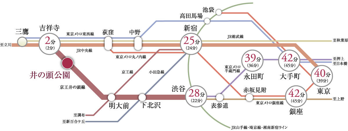 ※京王井の頭線「井の頭公園」駅より通勤時「銀座」駅へ42分(京王井の頭線利用、「吉祥寺」駅よりJR中央線快速利用、「四ツ谷」駅より東京メトロ丸ノ内線に乗り換え。平日日中は京王井の頭線利用、「永福町」駅より京王井の頭線急行利用、「渋谷」駅より東京メトロ銀座線に乗り換えて45分)※掲載の所要時間は、通勤時〈7:30~9:00〉の目的地へ到着する最多の所要時間です。乗り換え、待ち時間等を含みます。時間帯によって異なります。( )は平日日中〈11:00~16:00〉となります。※2025年12月現在の情報をもとに作成しておりますので、今後変更となる場合がございます。予めご了承ください。