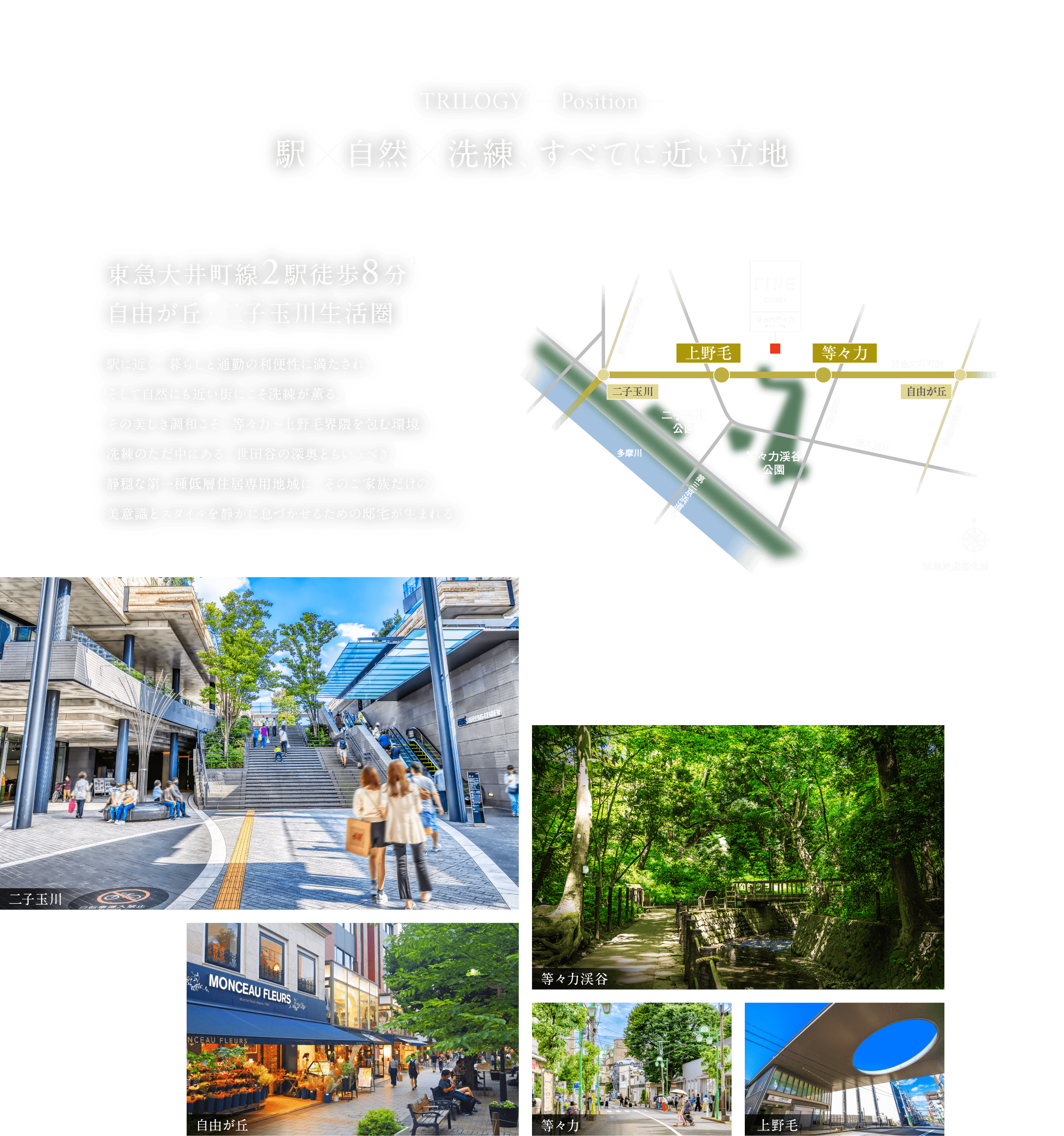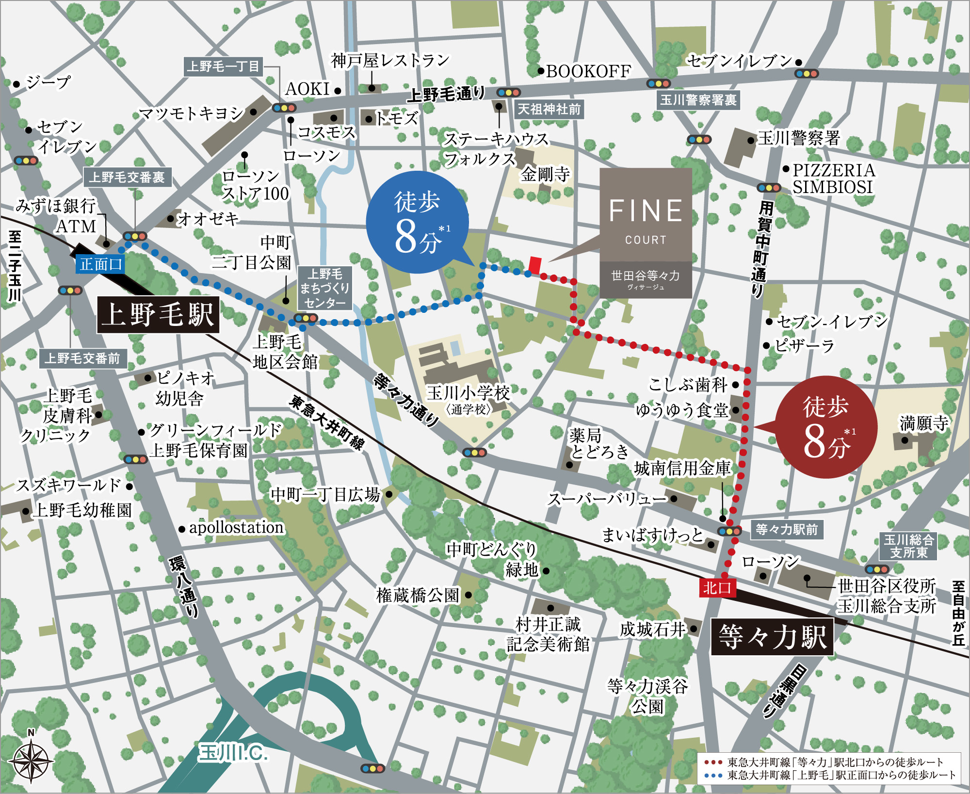 「等々力」駅・「上野毛」駅へ、ともに徒歩8分。