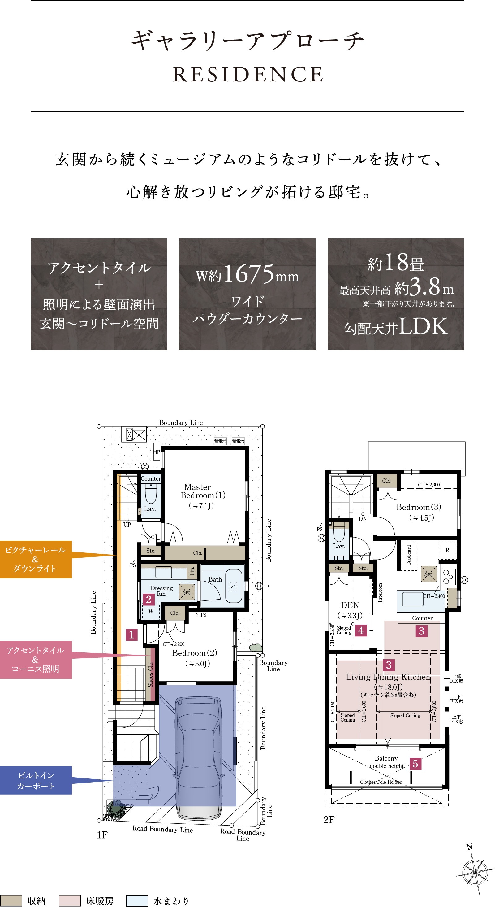 □1階床面積:51.83㎡ □2階床面積:49.67㎡ ※1号棟は上記延床面積に車庫面積8.92㎡を含みます。 ※施工等の関係で変更になる場合がございます。詳しくは施工図等でご確認ください。※外構の石、タイル等はおおよその施工範囲を示したものです。※坪数と畳数は約表記です。 ※DEN=書斎 ※敷地の一部(0.50㎡)には歩車の通行のため地役権が設定されます。詳しくは係員にお尋ねください。 ※家具・調度品等は販売価格に含まれません。予めご了承ください。