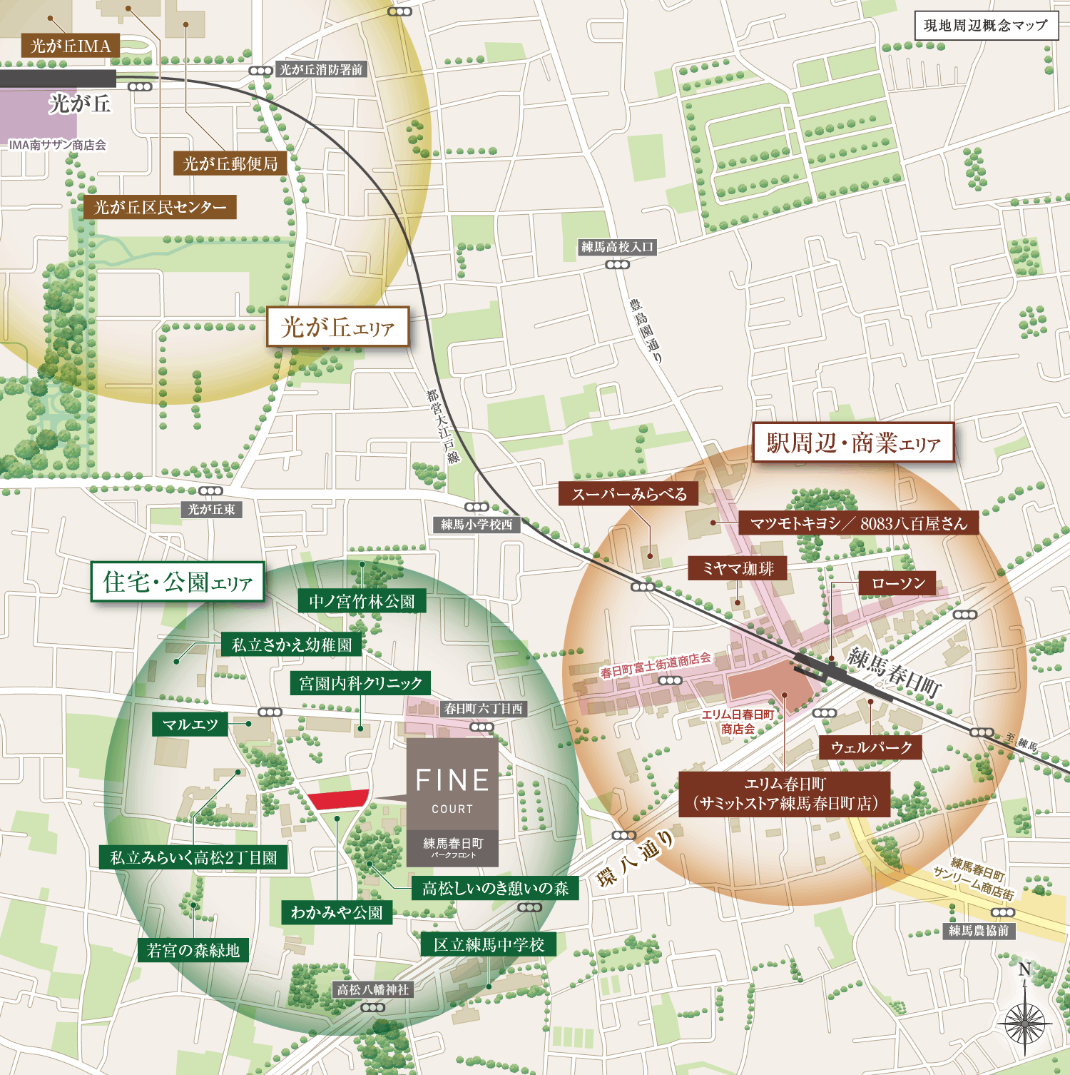 ※「マルエツ練馬高松店」(徒歩3分/No.1〜9、徒歩4分/No.10・11)、「サミットストア練馬春日町店」(徒歩8分/No.10・11、徒歩9分/No.1〜9)、「スーパーみらべる練馬春日町店」(徒歩9分/No.4〜11、徒歩10分/No.1〜3)、「ローソン練馬春日町三丁目店」(徒歩9分/No.10・11、徒歩10分/No.1〜9)、「マツモトキヨシ練馬春日町店/8083八百屋さん」(徒歩10分/No.4〜11、徒歩11分/No.1〜3)、「ミヤマ珈琲」(徒歩10分/No.3〜11、徒歩11分/No.1・2)、「ウェルパーク練馬春日町駅前店」(徒歩10分/No.9〜11、徒歩11分/No.1〜8)、「光が丘IMA」(徒歩15分/No.9〜11、徒歩16分/No.1〜8)、「区立わかみや公園」(徒歩1分/No.1〜11)、「高松しいのき憩いの森」(徒歩2分/No.1〜11)、「若宮の森緑地」(徒歩4分/No.1〜11)、「中ノ宮竹林公園」(徒歩5分/No.2〜11、徒歩6分/No.1)、「私立みらいく高松2丁目園」(徒歩2分/No.1〜5、徒歩3分/No.6〜11)、「区立練馬中学校」(徒歩5分/No.1〜11)、「私立さかえ幼稚園」(徒歩4分/No.1〜6、徒歩5分/No.7〜11)、「光が丘区民センター」(徒歩15分/No.1、徒歩16分/No.2〜11)、「光が丘郵便局」(徒歩16分/No.1・2・6〜11、徒歩17分/No.3〜5)