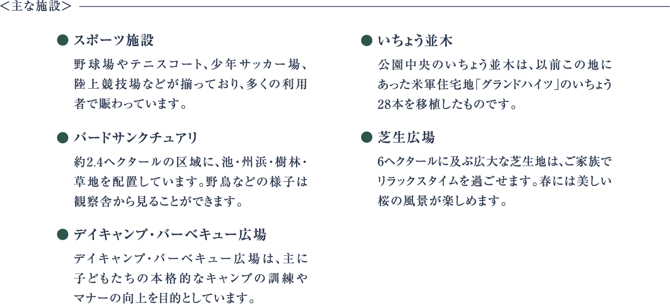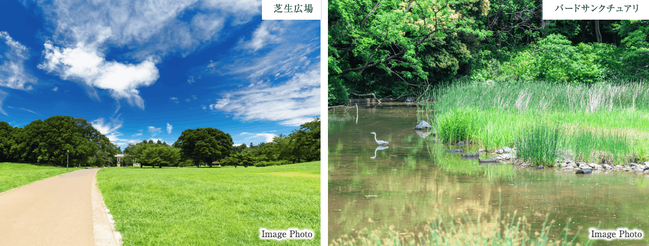 約60万㎡の都内有数の広さを誇る「都立光が丘公園」。各種スポーツ施設をはじめ、バードサンクチュアリやデイキャンプ場、バーベキュー広場などが揃い、ご家族で様々に楽しめる公園です。