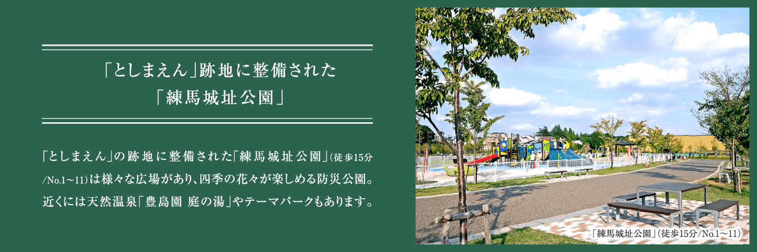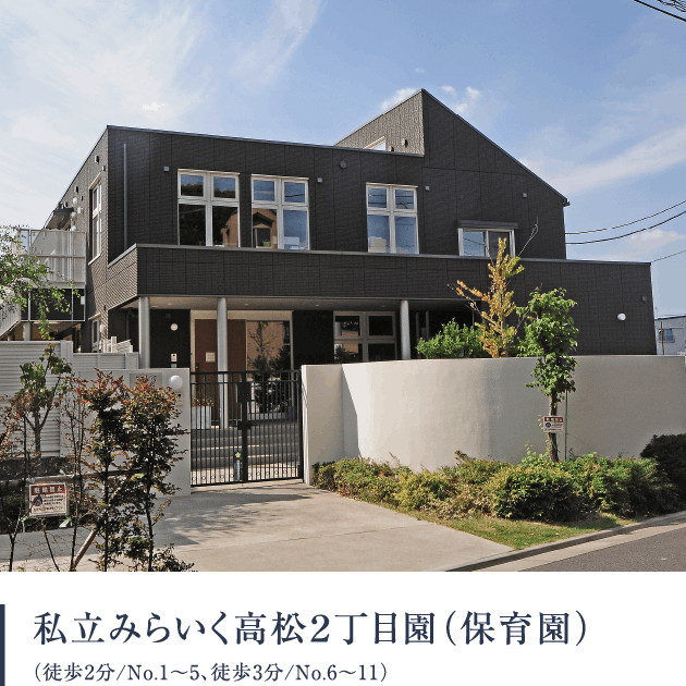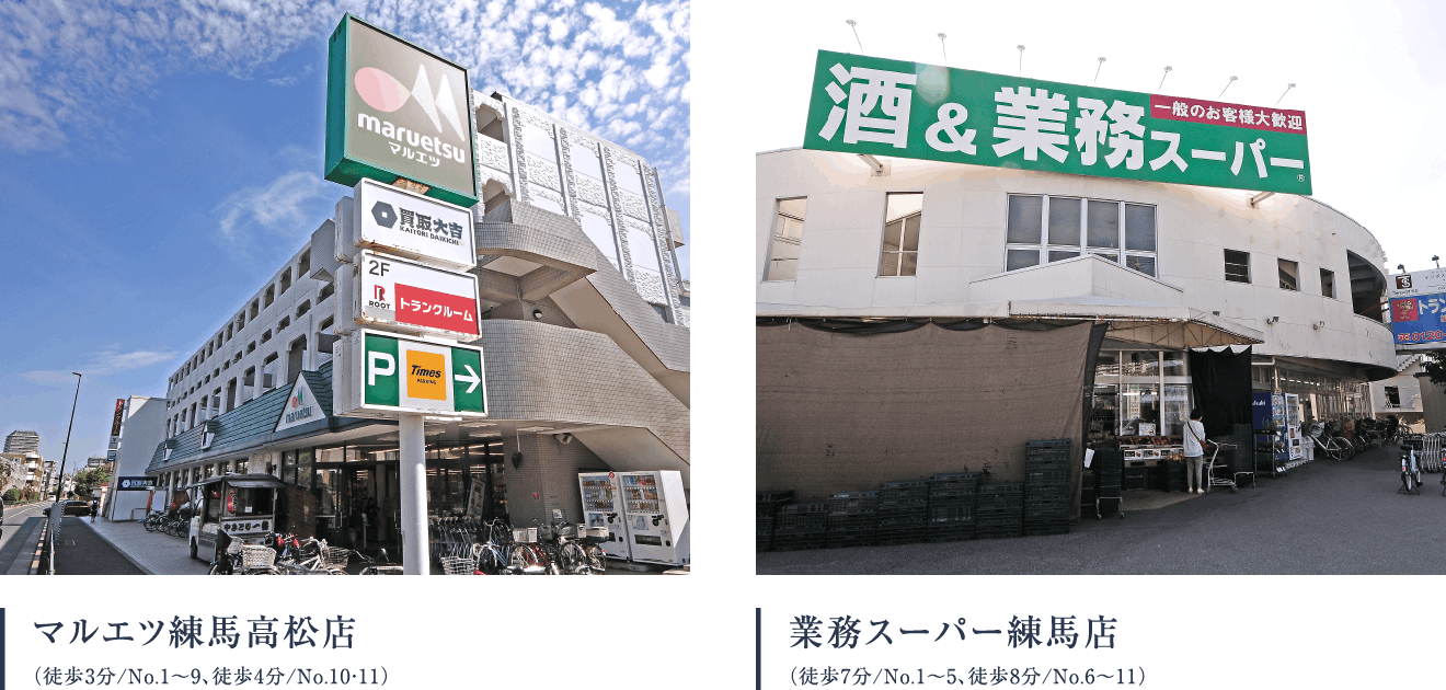 ※2:「マルエツ練馬高松店」(徒歩3分/No.1〜9、徒歩4分/No.10・11)、「業務スーパー練馬店」(徒歩7分/No.1〜5、徒歩8分/No.6〜11)、「サミットストア練馬春日町店」(徒歩8分/No.10・11、徒歩9分/No.1〜9)、「区立わかみや公園」(徒歩1分/No.1〜11)、「若宮の森緑地」(徒歩4分/No.1〜11)、「夏の雲公園」(徒歩8分/No.1・2、徒歩9分/No.3〜11)