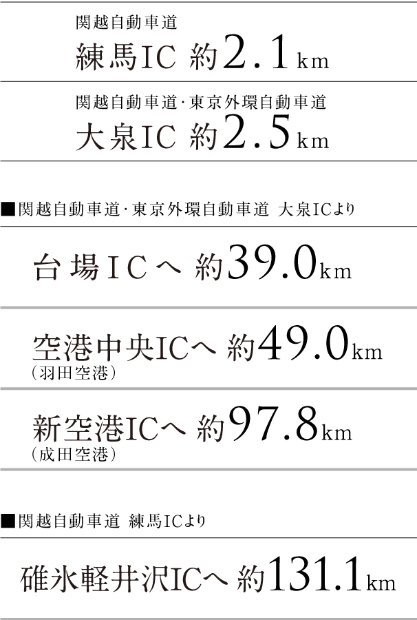関越自動車道・練馬ICまで約1.3km。関越道と連絡する大泉JCTからは東京外環自動車道経由で首都高に出ることができ、都心へのアクセスもスムーズです。