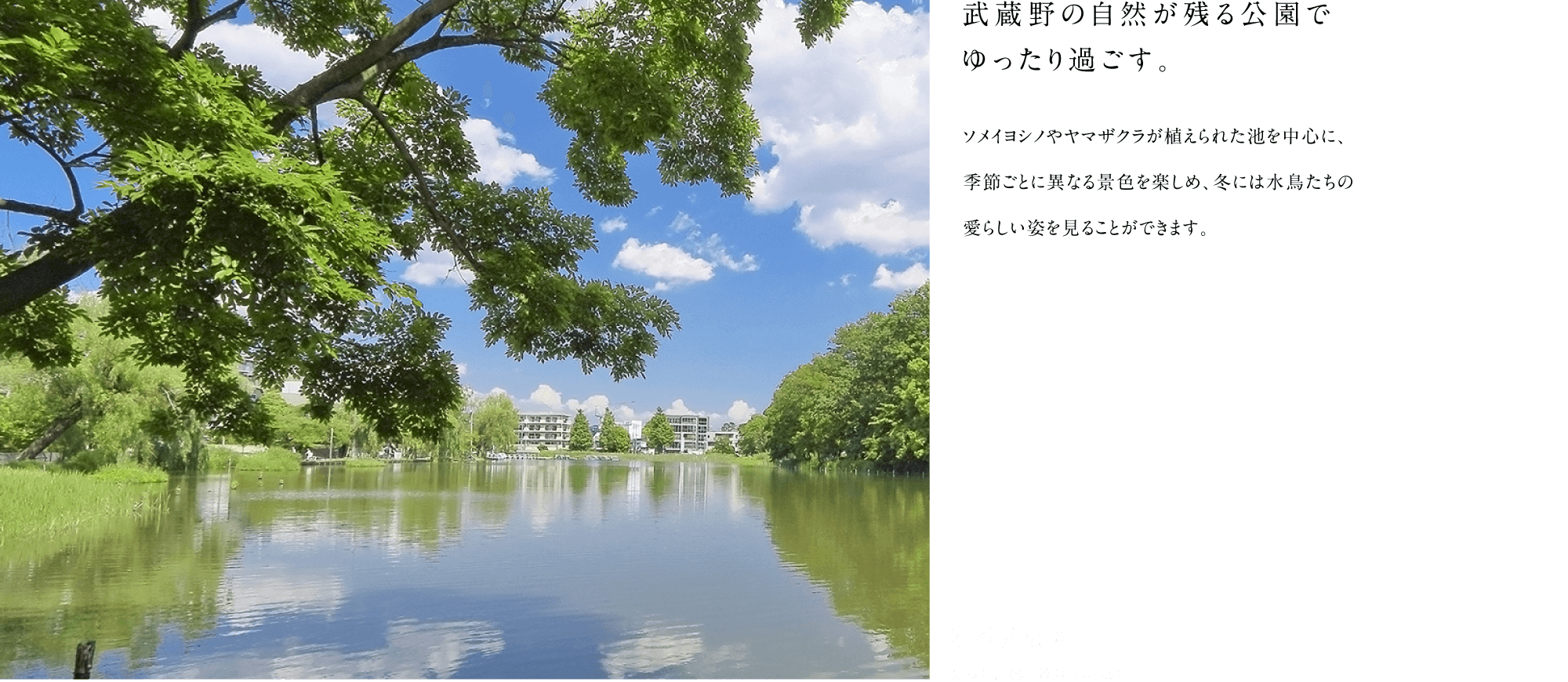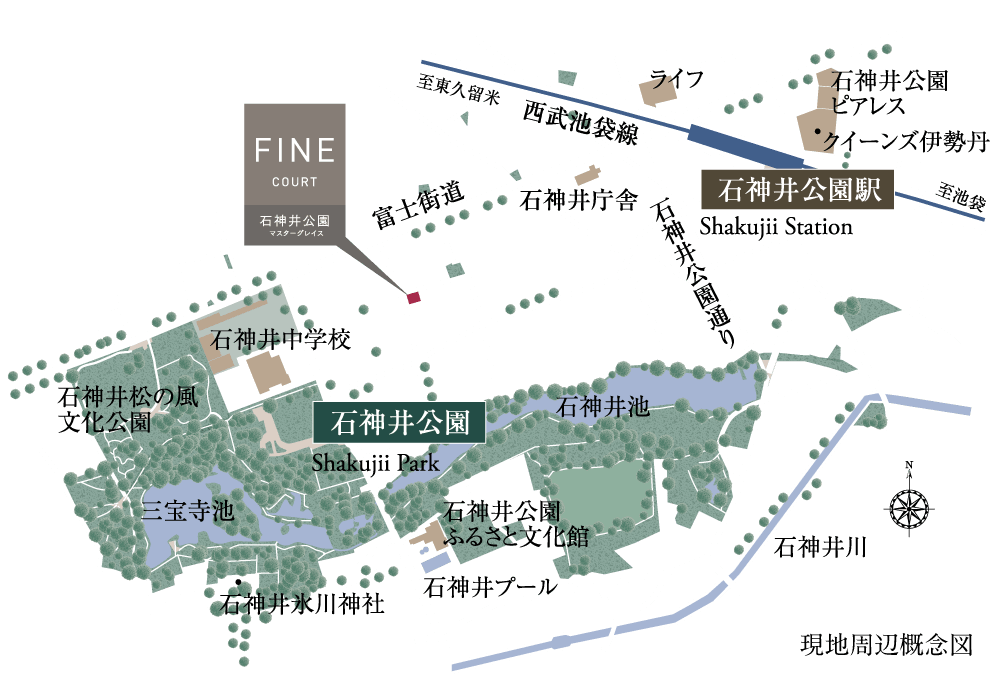 石神井公園とともに歳月を重ねたその地に、品格薫る家々がゆったりと並び建つ、風光の邸宅地。現地は、静謐な時が息づく石神井町六丁目の一画にあり、石神井公園徒歩4分にして、新たな再開発※の完了も間近な「石神井公園」駅徒歩10分。武蔵野の豊かな自然と都市の洗練を日常とするロケーションにあります。