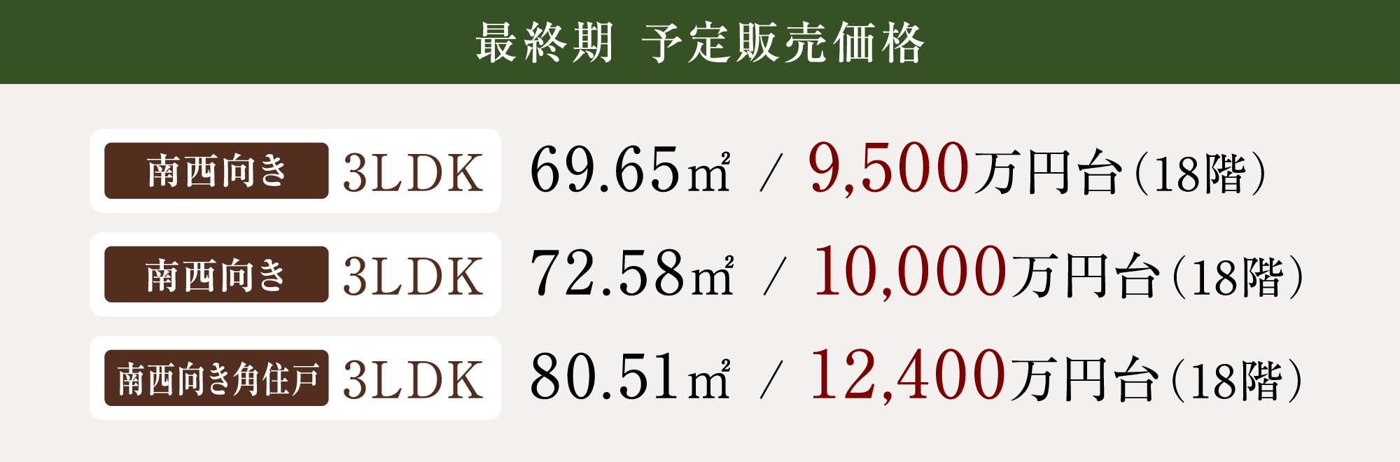 ■予定販売価格/9,500万円台~12,400万円台 ■予定最多販売価格帯/10,000万円台 ※最終期の販売総戸数に対応 ※100万円単位