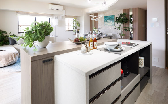 調理家電の置き場所としても便利なマルチカウンター。家族が並んで作業もできるゆとりあるワークトップです。