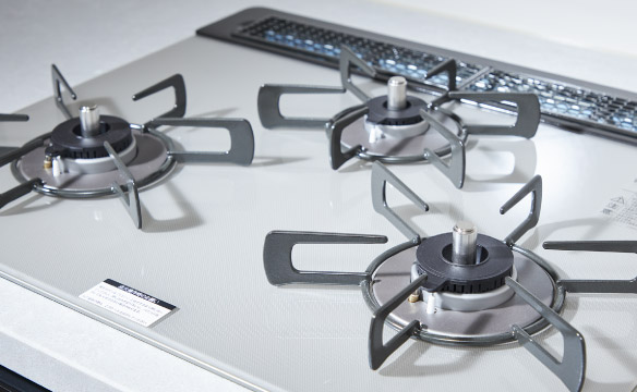 多彩な機能を備えたスタイリッシュデザインのビルトインガスコンロ。お手入れしやすいガラストップです。