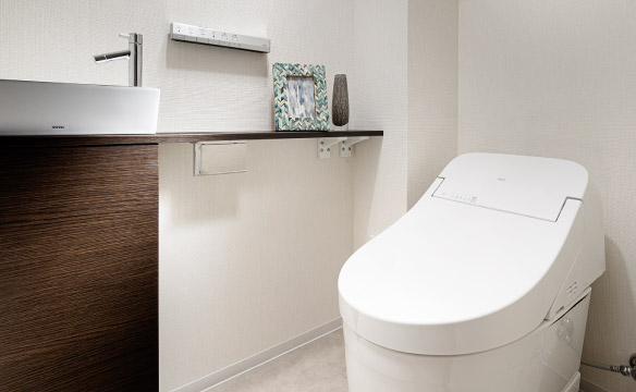 すっきりとしたデザインのコンパクトな手洗いカウンター付きトイレ。来客の際などにも便利です。