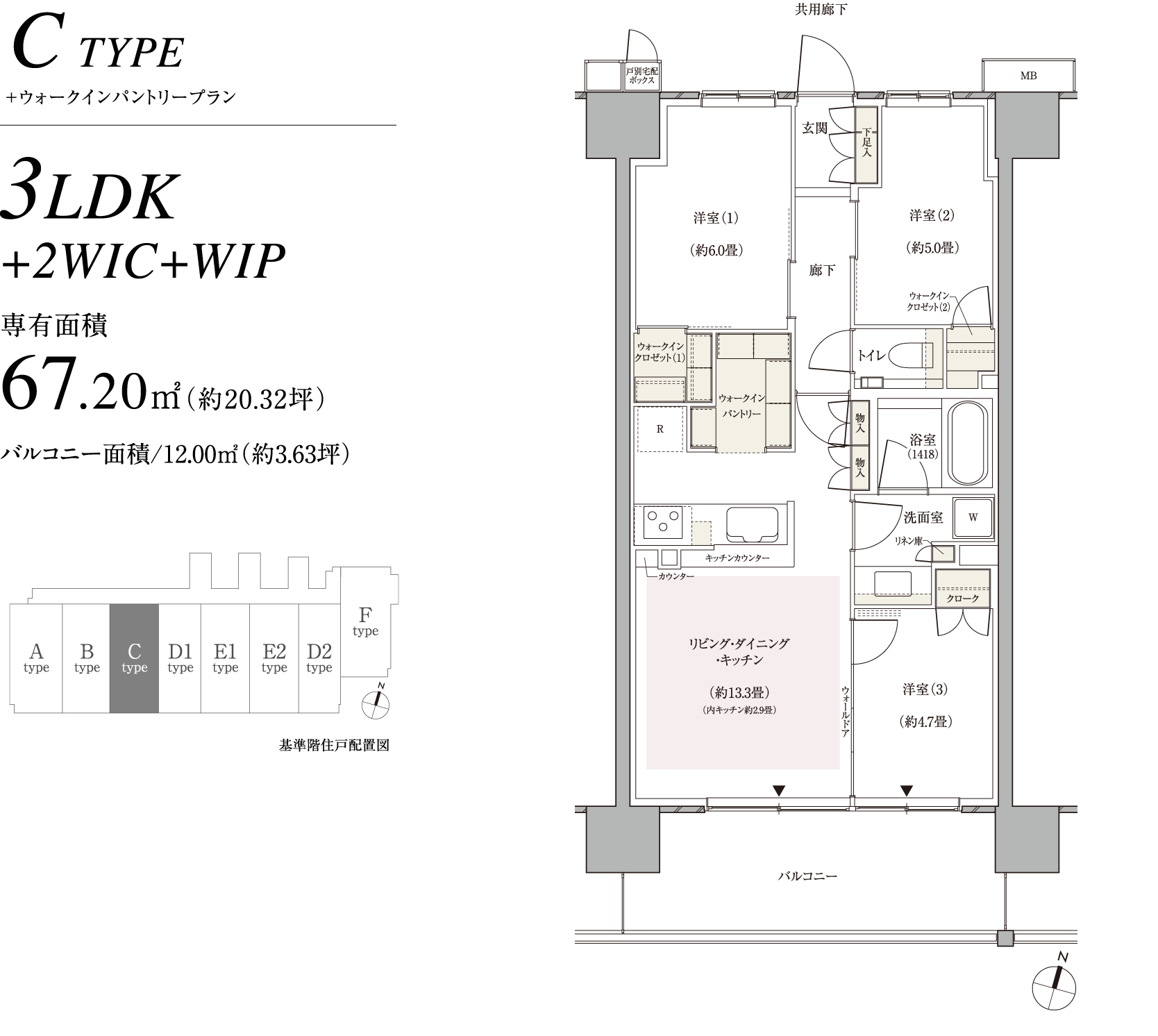 ※WIC=ウォークインクロゼット WIP=ウォークインパントリー ※掲載の間取り図面は設計段階のもので、変更になる場合があります。 ※リビング・ダイニング・キッチン部分の畳数には、冷蔵庫置場が含まれています。 ※住戸により、仕様・形状が異なる場合があります。 ※バルコニー手摺りの仕様および形状は階数によって異なります。 ※バルコニーの使用については管理規約等に従っていただきます。 ※代表タイプの間取りを表示しております。販売住戸の間取りについては本広告時の物件概要の「販売住戸の一覧」をご覧ください。