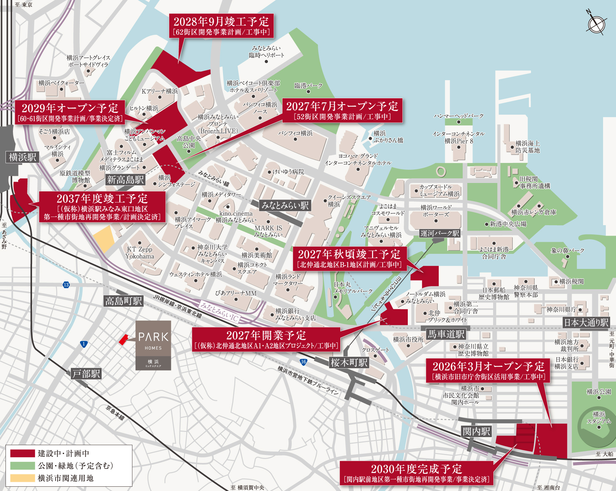 ※掲載の内容は、横浜市HP・都市整備に掲載されている情報を元に作図したものです。(2025年11月現在)また、開発は遅れる場合があります。