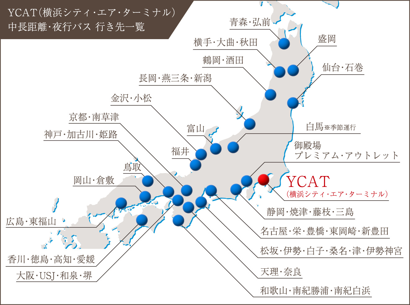 横浜駅東口バスターミナル&YCATから、高速バスで全国各地へ。