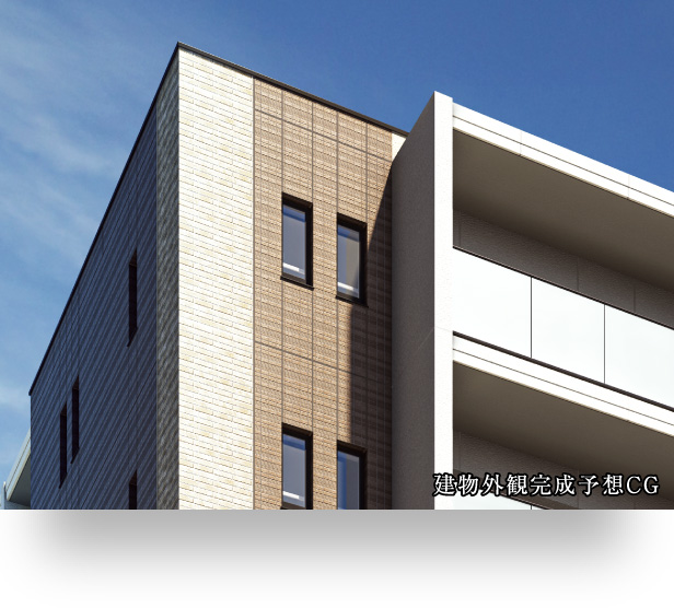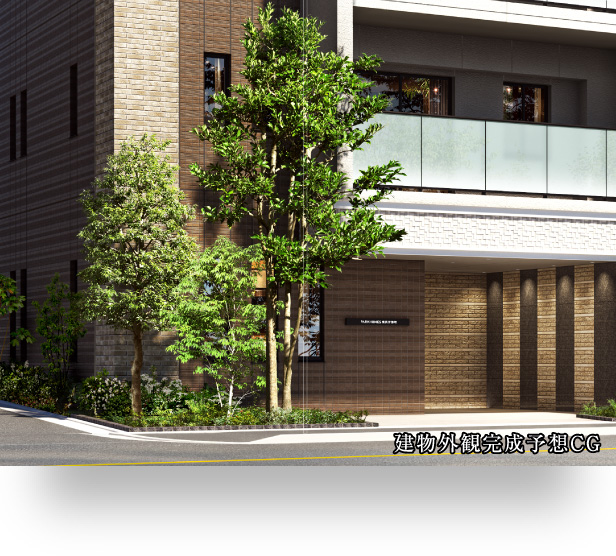 ※掲載の建物外観・エントランス外観完成予想CGは図面を基に描き起こしたもので、形状・色等は実際とは異なります。外観形状の細部・設備機器等は表現しておりません表現されている植栽は竣工から初期の育成期間を経た状態のものを想定して描いており、竣工時は植物の生育を見込んで必要な間隔をとって植えております。施工上の都合により、設定位置・樹高・本数等変更になる場合があります。
