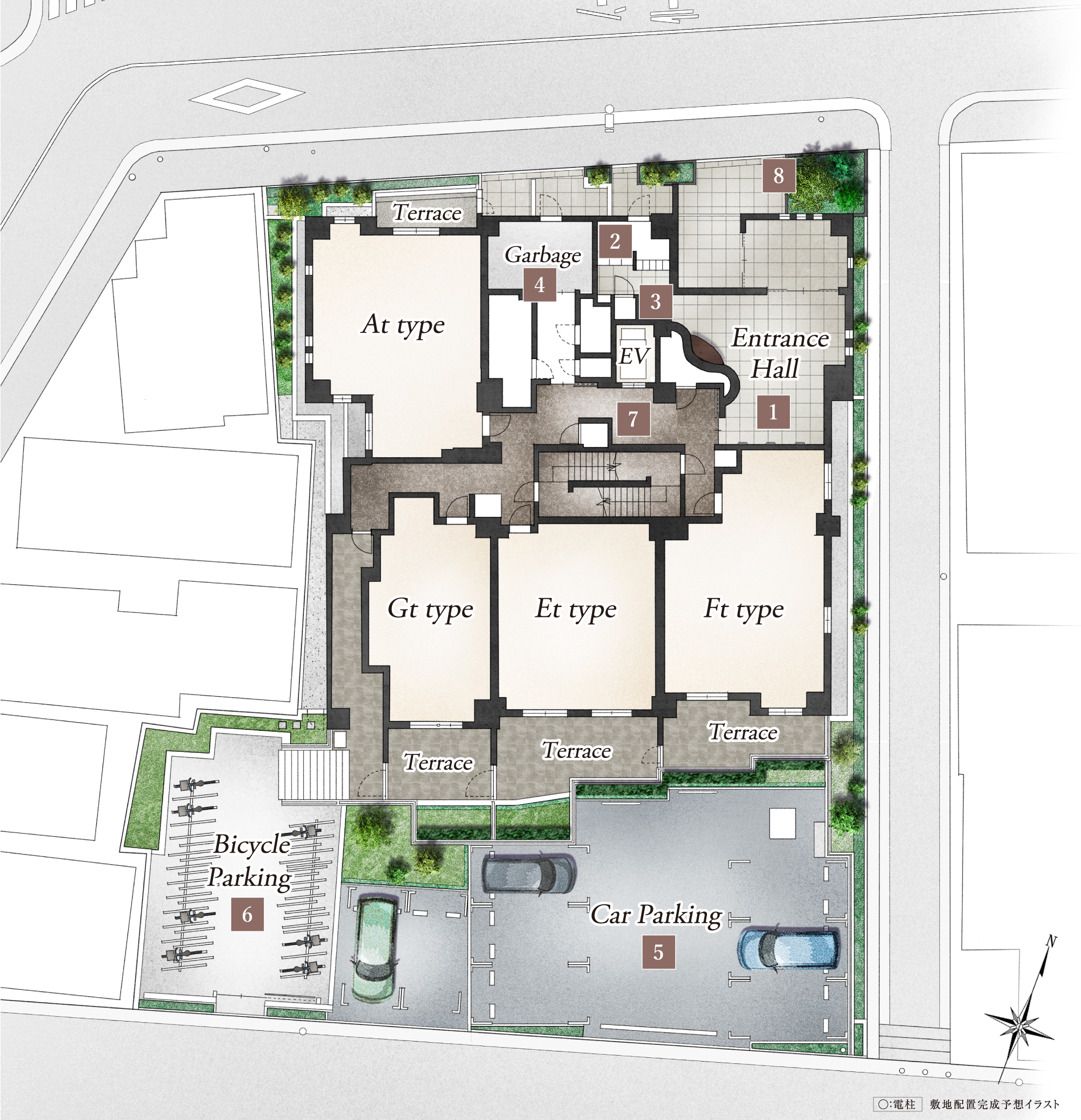 ※掲載の敷地配置完成予想イラストは計画段階の図面を基に描き起こしたもので、周辺建物や道路等の一部を省略・簡略化の上表現しており、実際とは多少異なります。