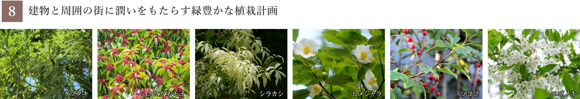 エントランス周りには在来種を中心に高木から低木までを立体的に配し、緑豊かな景観を形成しました。シンボルツリーをはじめ潤いを演出し、街並みに新たな風景をもたらします。