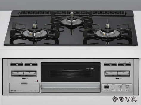 美しくお手入れがしやすい、ガラストップの3口コンロです。水無し片面焼きグリルつき。