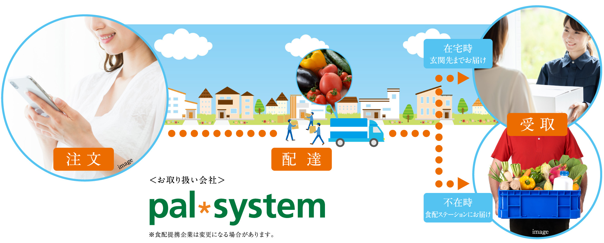 提携先の食材配達会社に、ネットで手軽に注文OK。週に1回の宅配利用が可能です。ご在宅時には玄関まで、ご不在時には食配ステーションまでお届けします。お米やペットボトルなどの重い商品の購入や留守の多いご家庭、家事効率の向上にも役立つ便利なサービスです。※別途契約が必要となります。(有償)