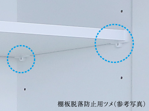 地震の揺れで扉が開いて、中のものが飛び出さないよう、キッチンの吊戸棚の扉に耐震ラッチ※を設置。またキッチン吊戸棚の棚板には、水平方向の大きな揺れにも動きにくく、棚をしっかりと固定する脱落防止用のツメを設けています。