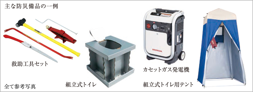 防災備品を収納した防災倉庫を、1階に設置しています。この防災備品は共助に必要な備品を中心に取り揃えています。合わせてエントランスを災害対策拠点とし、お住まいのみなさまが共助活動を行う場所としています。