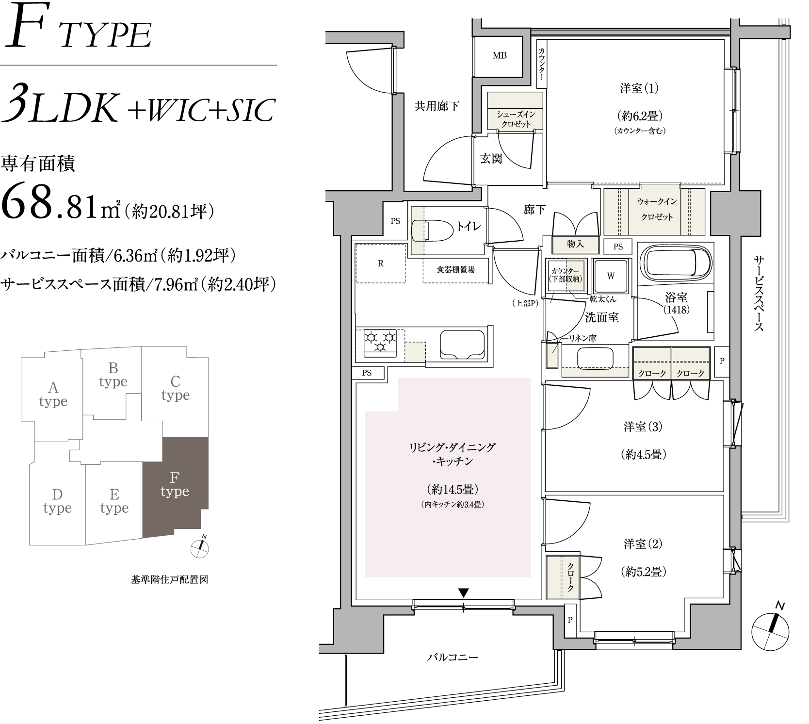 ※WIC=ウォークインクロゼット SIC=シューズインクロゼット ※掲載の間取り図面は設計段階のもので、変更になる場合があります。 ※リビング・ダイニング・キッチン部分の畳数には、冷蔵庫置場・食器棚置場が含まれています。 ※住戸により、仕様・形状が異なる場合があります。 ※バルコニー手摺りの仕様および形状は階数によって異なります。 ※バルコニーの使用については管理規約等に従っていただきます。 ※代表タイプの間取りを表示しております。販売住戸の間取りについては本広告時の物件概要の「販売住戸の一覧」をご覧ください。