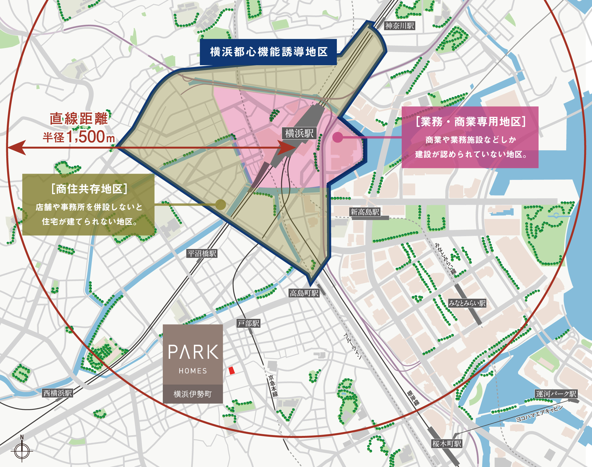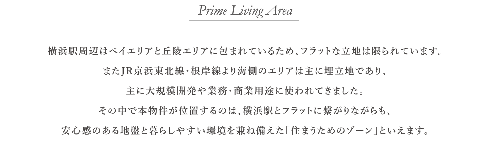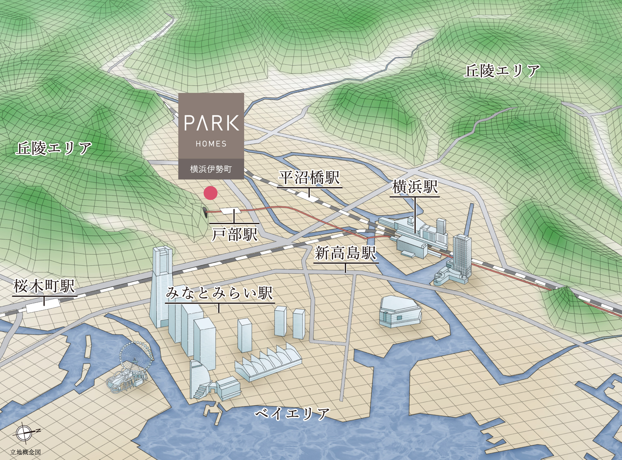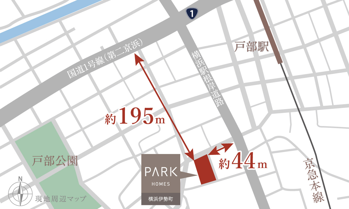 「パークホームズ横浜伊勢町」は、国道1号線(第二京浜)等の大きな幹線道路を身近にしながらも、一歩内側に入った場所に立地。周辺は穏やかな空気を感じる住宅街でありながら、少し歩くだけで横浜の賑わいを自在に使いこなせる。その絶妙な距離感こそ、この地の大きな魅力です。