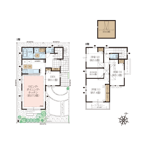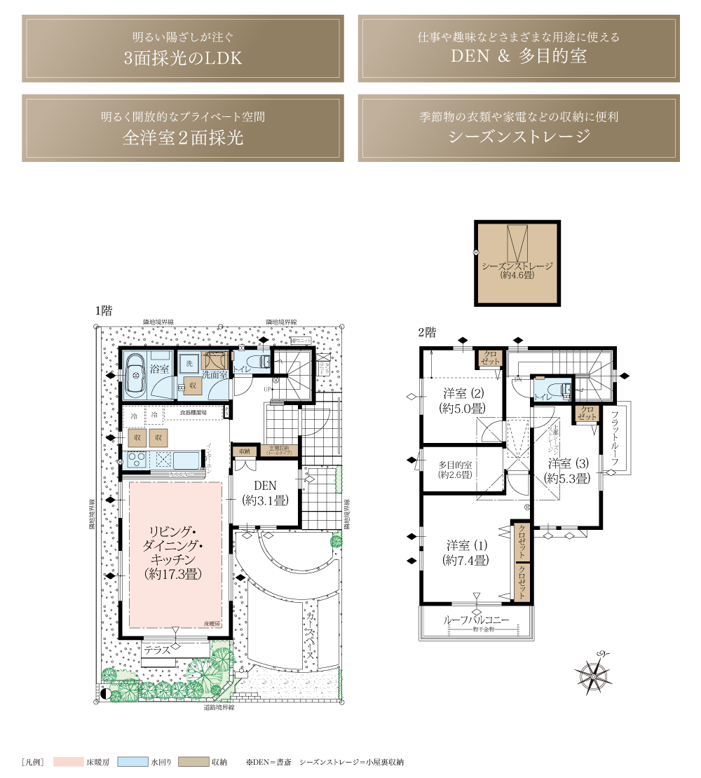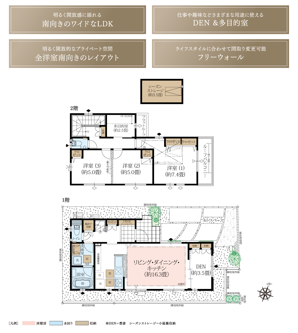※掲載の間取り図は、図面を基に描き起こしたもので、実際と異なる場合があります。また、施工上の理由および改良のため、変更することがございます。※外構の石、タイル等はおおよその施工範囲を示したものです。※坪数と畳数は約表記です。※シーズンストレージの畳数には収納ハシゴを含みます。※フリーウォールの撤去による間取り変更には、設計費・工事費が必要となります。※DEN=書斎。