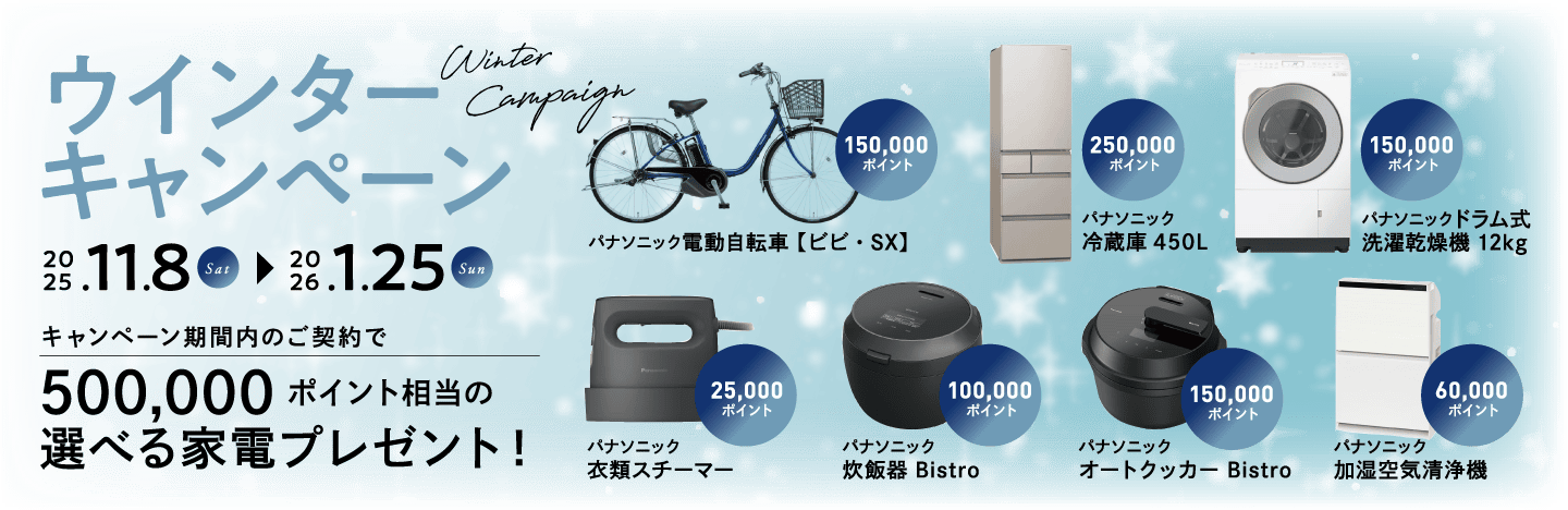 ※表記の製品情報、及び必要ポイント数は2025年8月29日時点の情報になります。一部製品の内容や価格、仕様等が変更になる可能性がございます。※掲載のポイント数と実際の店頭価格は必ずしも一致しません。詳しい製品情報等はメーカー公式ホームページよりご確認下さい。※その他ご不明点は営業担当までお問い合わせください。※「ウインターキャンペーン」は2026年1月25日までに対象物件のご契約をした方が対象です。※指定の家電から、50万ポイント相当の家電品と交換することが出来ます。※交換希望品が50万ポイントに届かない場合、差分の還元は致しません。※50万ポイントを超えての交換はできません。別途追加有償契約を締結しての追加購入のご相談は可能です。その場合は別途お見積りさせて頂きます。※在庫状況によっては商品のお引き渡しがご入居後となる場合がございます。※在庫状況によってはご希望の商品と交換できない場合がございます。その場合は別の商品をお選びいただきます。※特典内容は予告なく変更となる場合がございます。※他イベントおよびキャンペーン特典との併用は不可となります。