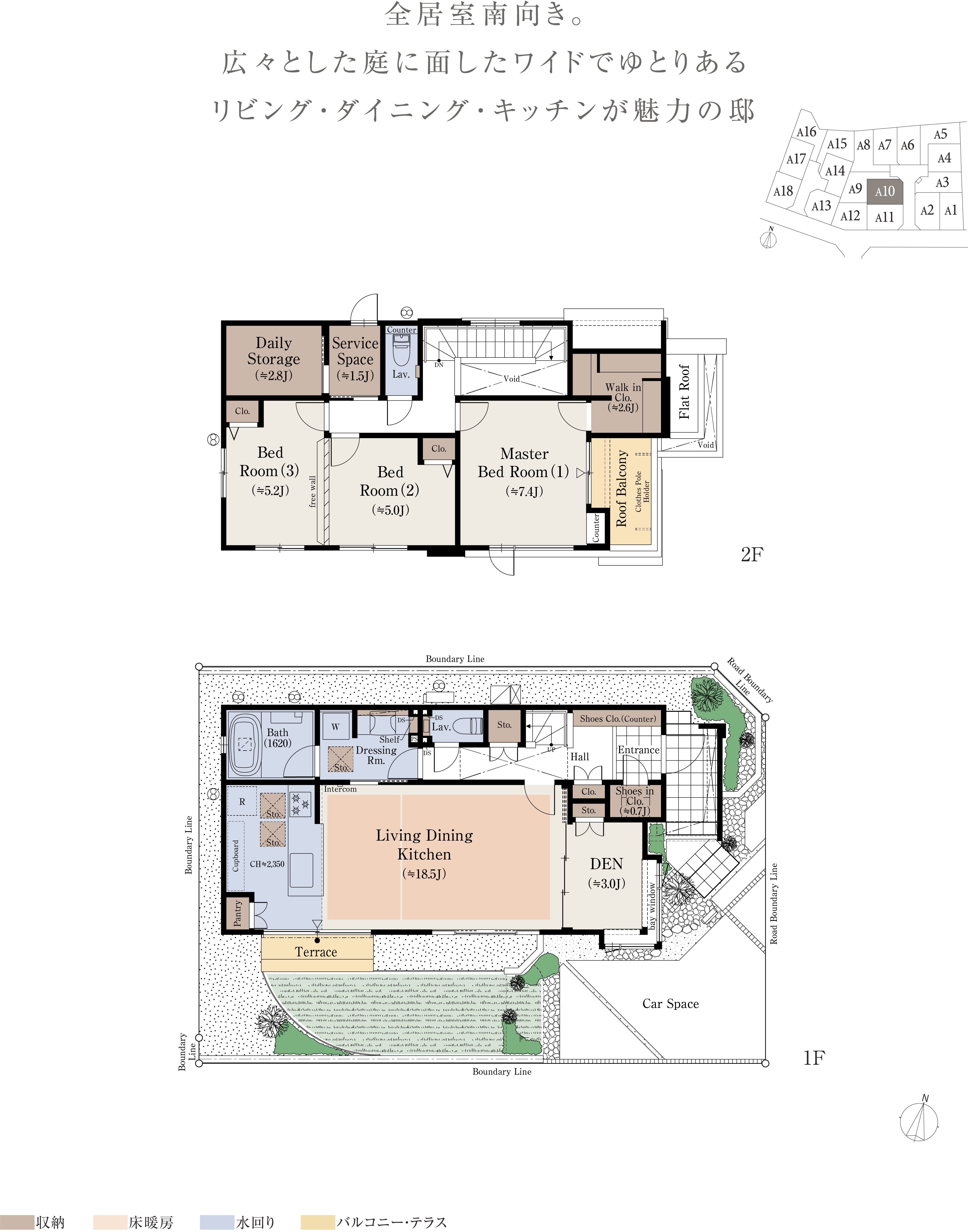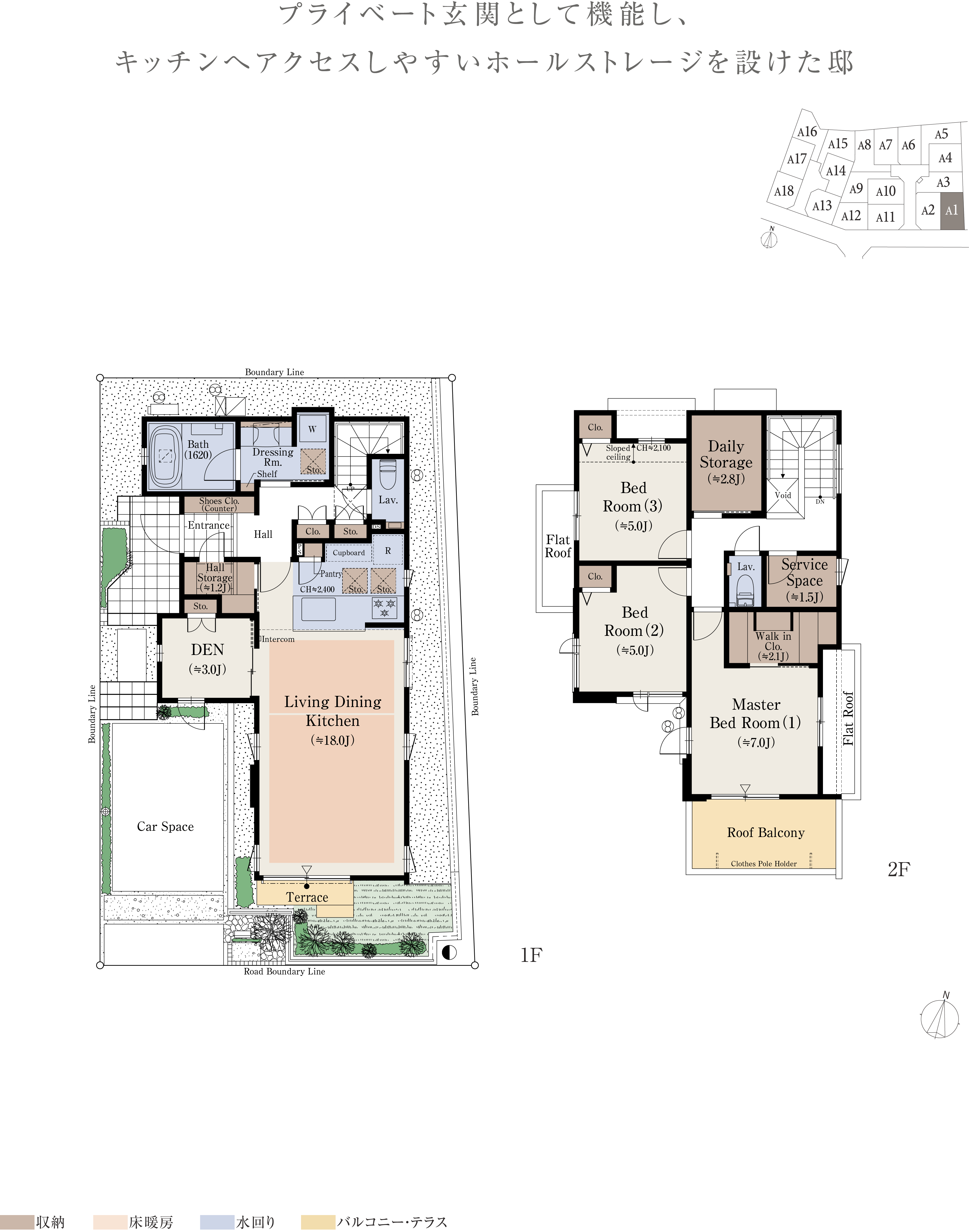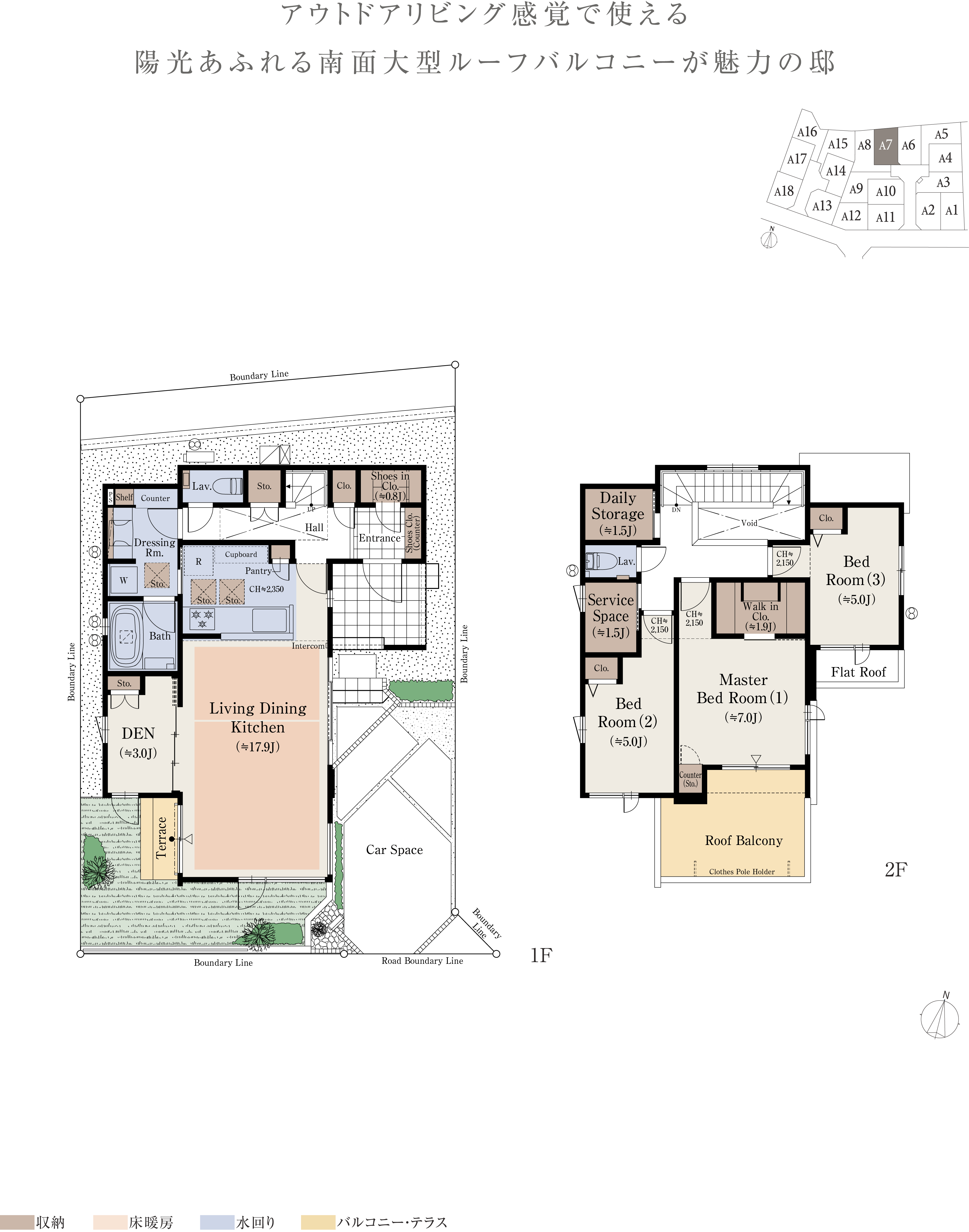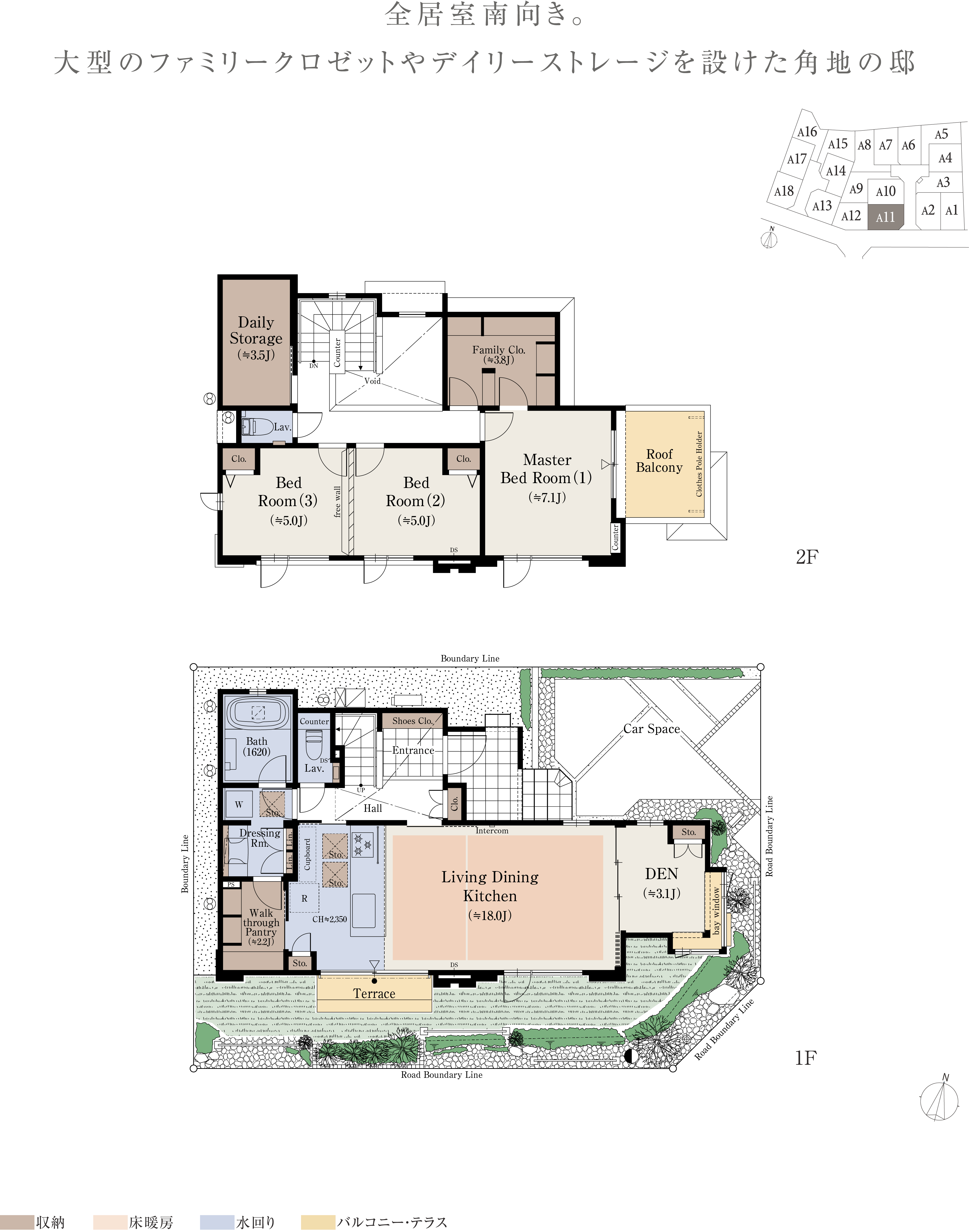※本物件の代表タイプの間取りを表示しています。販売住戸の間取りにつきましては、本広告時の物件概要内「販売住戸の一覧」をご覧ください。※掲載の間取りは計画段階の図面を基に描き起こしたもので実際とは多少異なります。 ※施工等の関係で変更になる場合がございます。詳しくは施工図等でご確認ください。※外構の石、タイル等はおおよその施工範囲を示したものです。※フリーウォールの撤去による間取り変更には、設計費・工事費が必要となります。※坪数と畳数は約表記です。※J=約畳数 ※DEN=書斎 ※WTP=ウォークスルーパントリー ※WIC=ウォークインクロゼット ※デイリーストレージ=下屋裏収納 ※サービスルーム=納戸 ※シーズンストレージ=小屋裏収納
