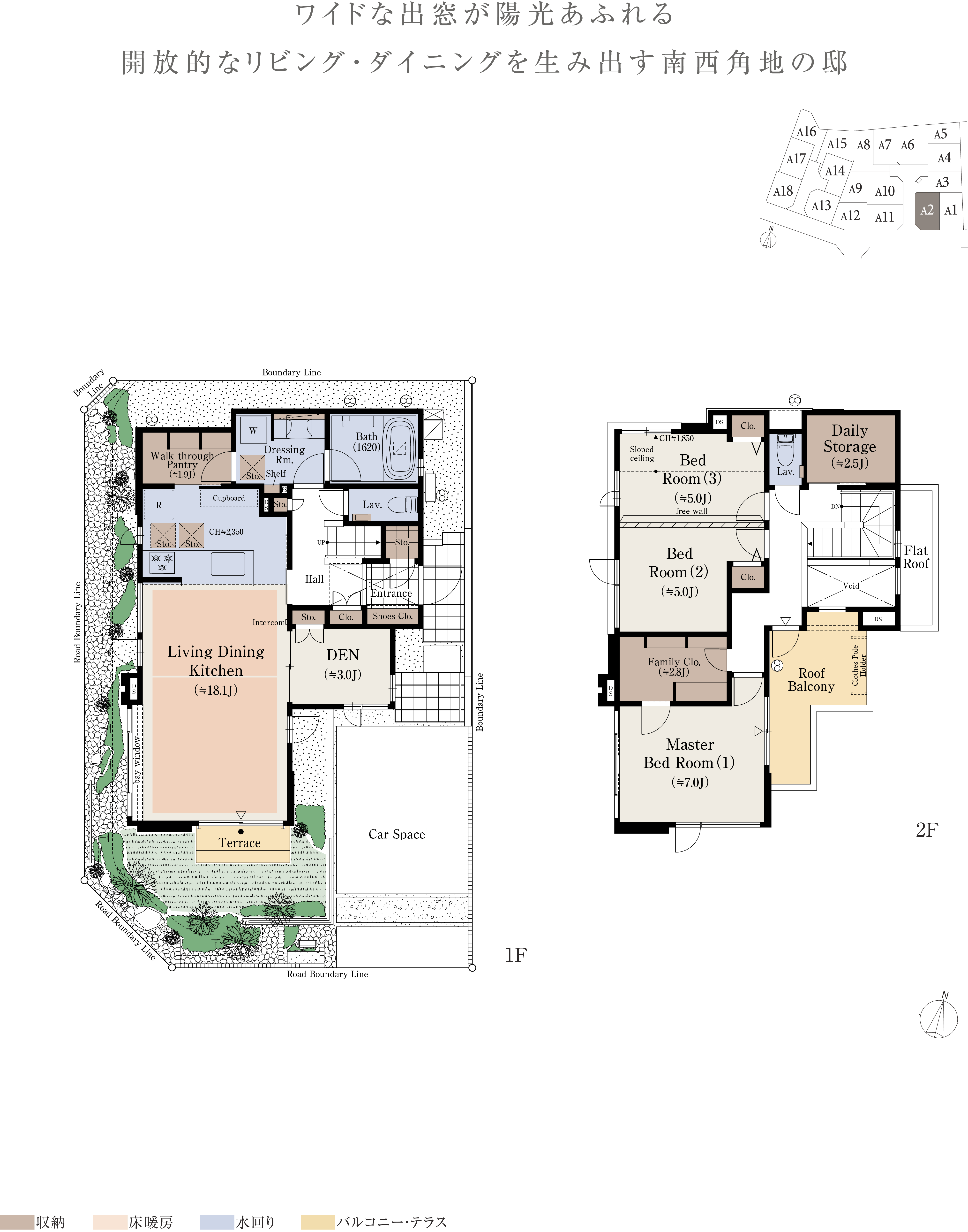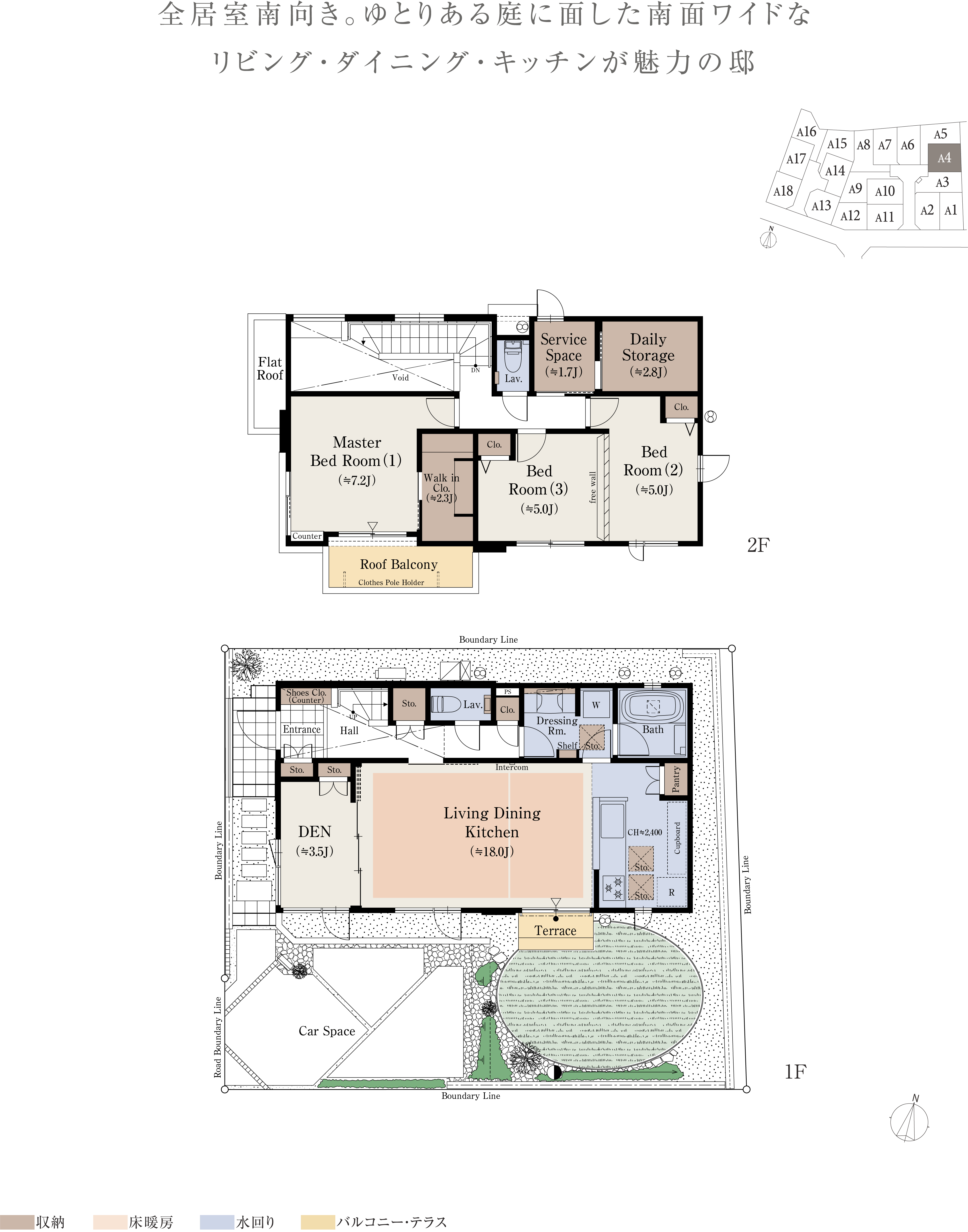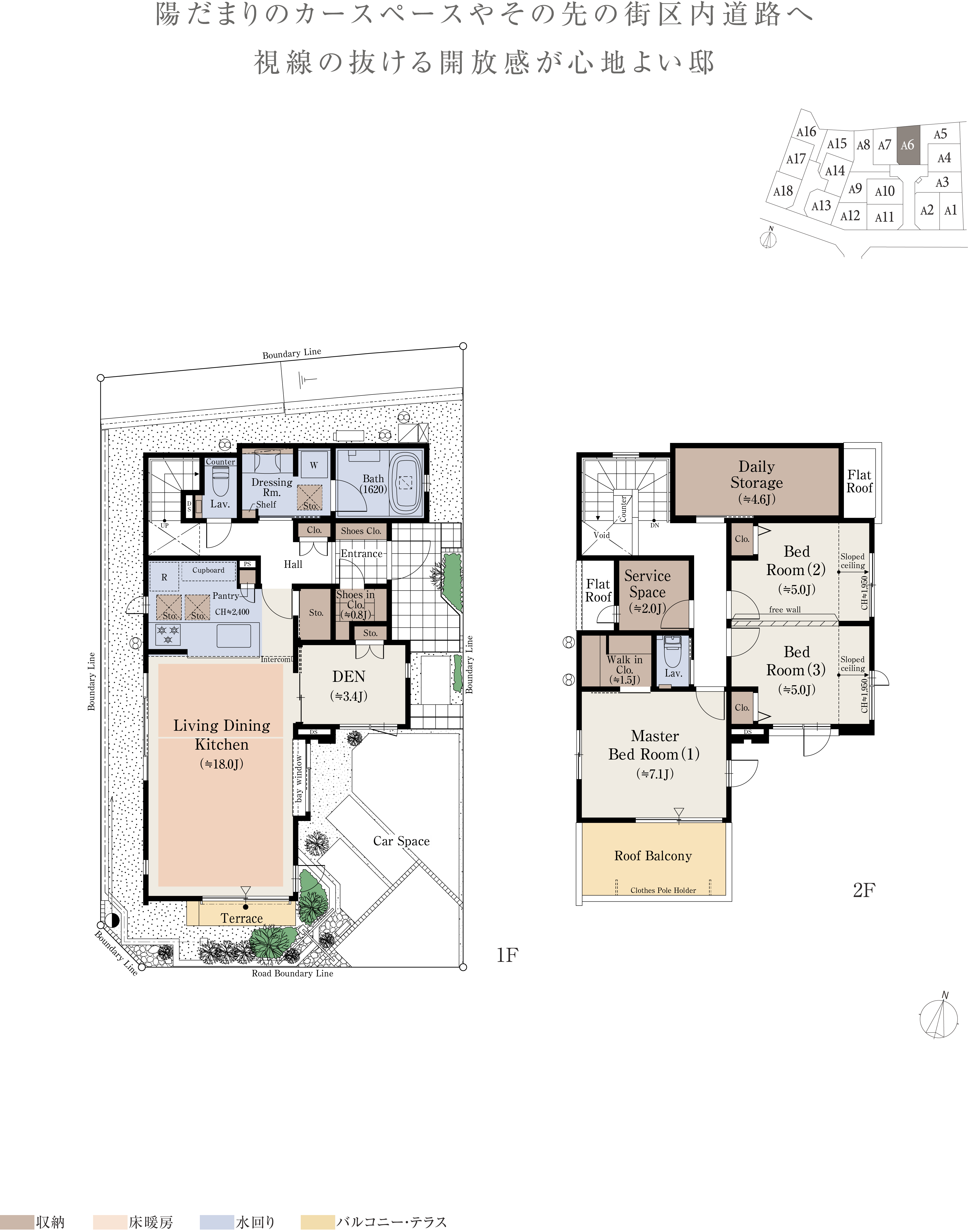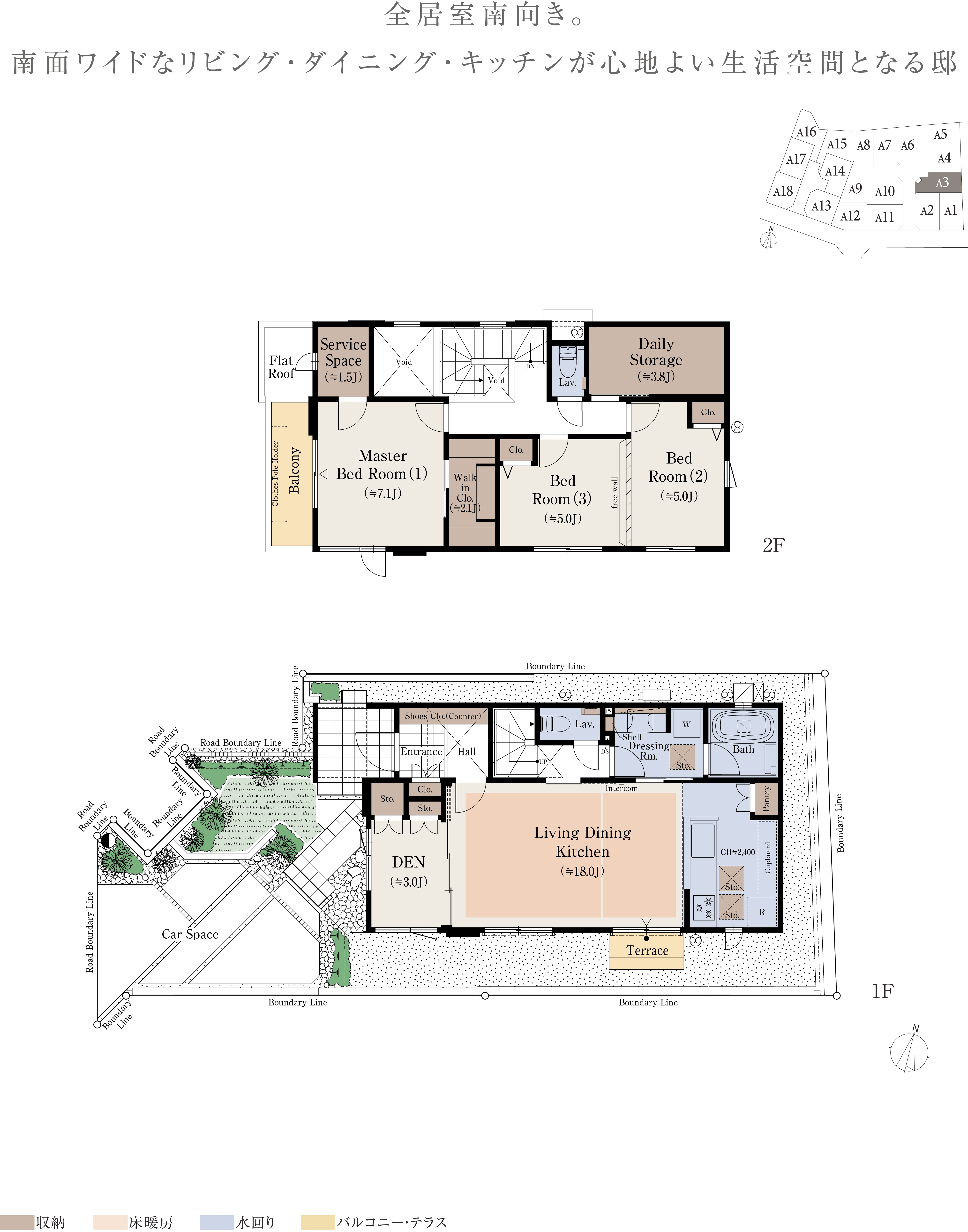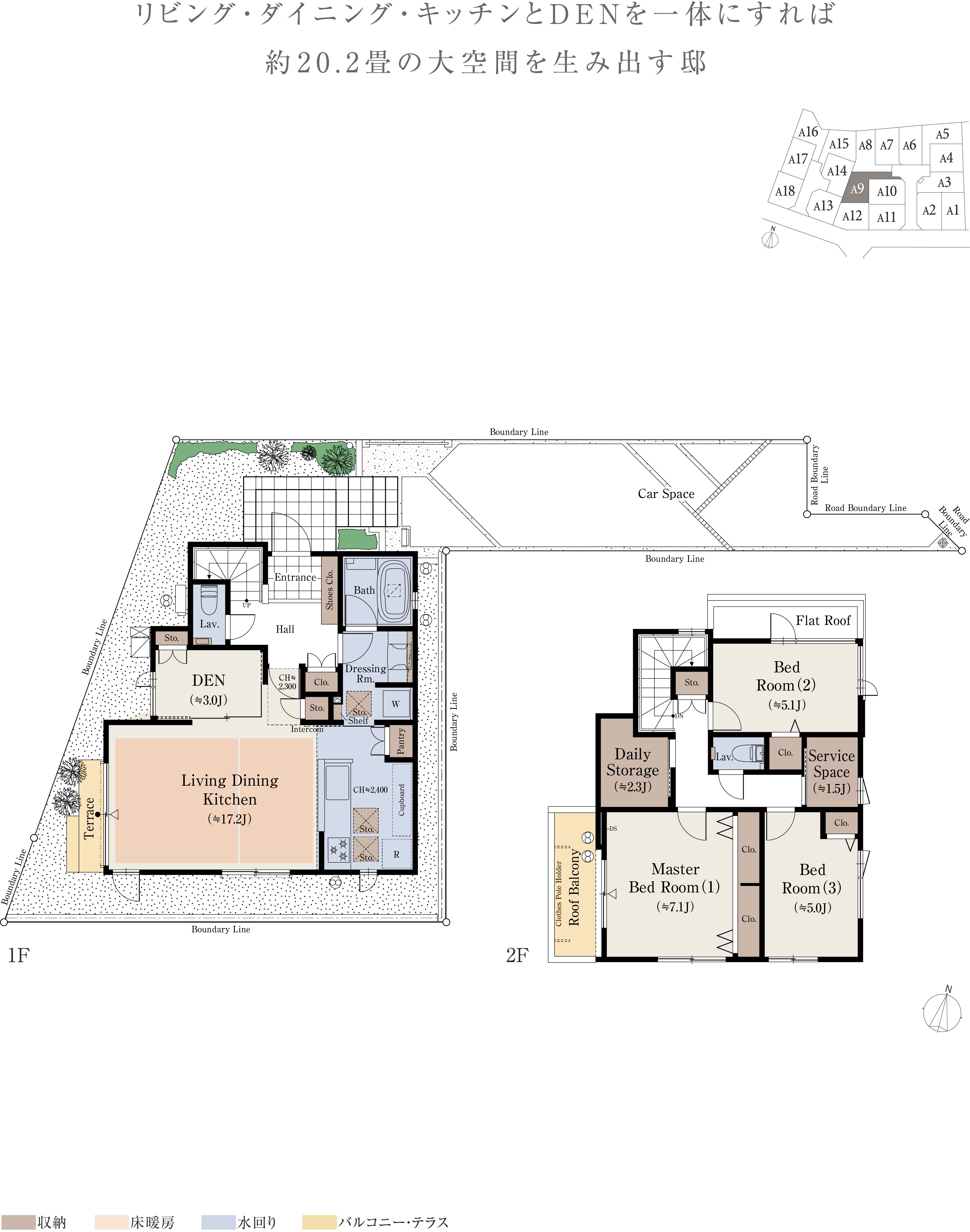 ※本物件の代表タイプの間取りを表示しています。販売住戸の間取りにつきましては、本広告時の物件概要内「販売住戸の一覧」をご覧ください。※掲載の間取りは計画段階の図面を基に描き起こしたもので実際とは多少異なります。 ※施工等の関係で変更になる場合がございます。詳しくは施工図等でご確認ください。※外構の石、タイル等はおおよその施工範囲を示したものです。※フリーウォールの撤去による間取り変更には、設計費・工事費が必要となります。※坪数と畳数は約表記です。※J=約畳数 ※DEN=書斎 ※WTP=ウォークスルーパントリー ※WIC=ウォークインクロゼット ※デイリーストレージ=下屋裏収納 ※サービスルーム=納戸 ※シーズンストレージ=小屋裏収納