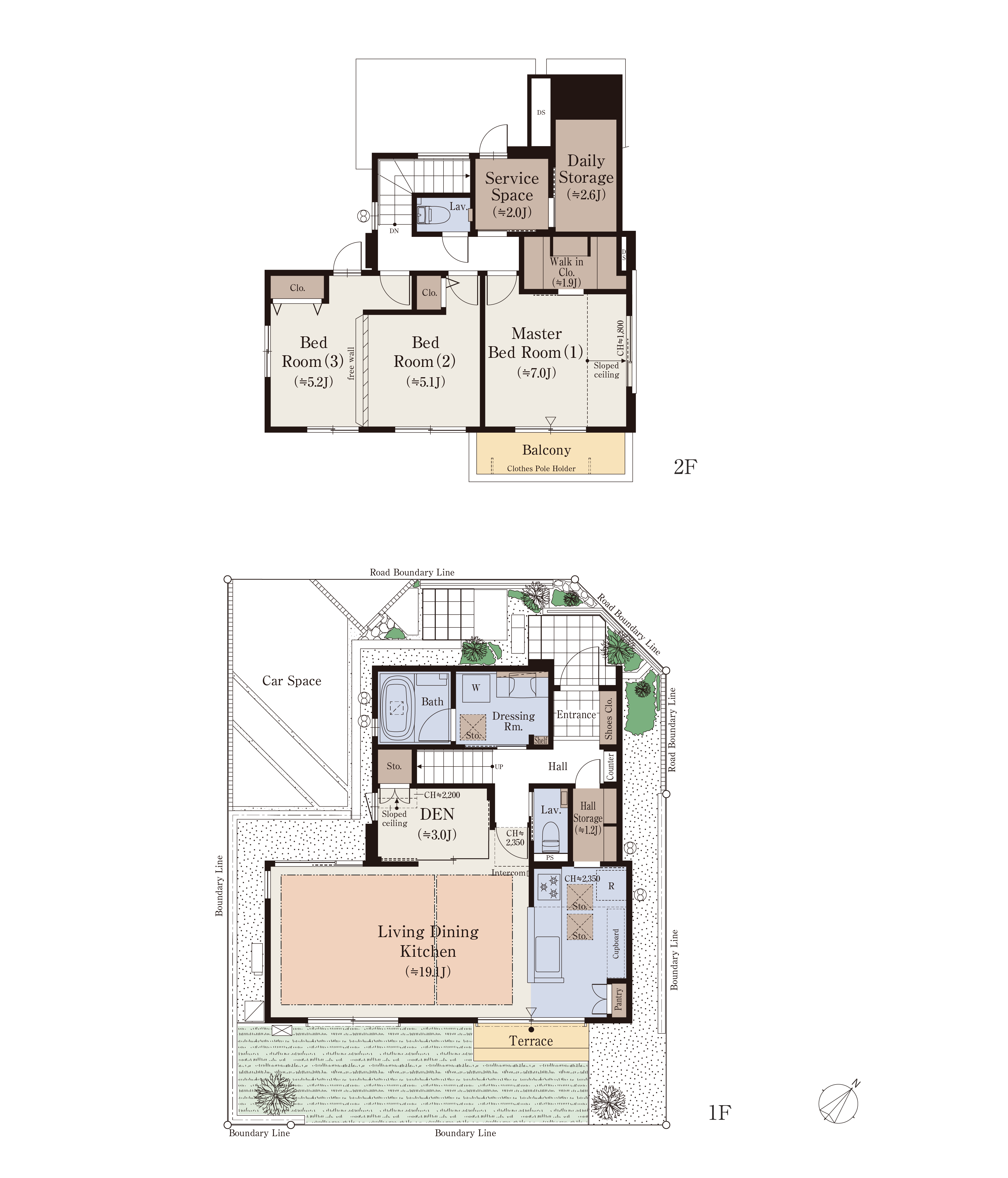 ※本物件の代表タイプの間取りを表示しています。販売住戸の間取りにつきましては、本広告時の物件概要内「販売住戸の一覧」をご覧ください。※掲載の間取りは計画段階の図面を基に描き起こしたもので実際とは多少異なります。 ※施工等の関係で変更になる場合がございます。詳しくは施工図等でご確認ください。※外構の石、タイル等はおおよその施工範囲を示したものです。※フリーウォールの撤去による間取り変更には、設計費・工事費が必要となります。※坪数と畳数は約表記です。※J=約畳数 ※DEN=書斎 ※WTP=ウォークスルーパントリー ※WIC=ウォークインクロゼット ※デイリーストレージ=下屋裏収納 ※サービスルーム=納戸