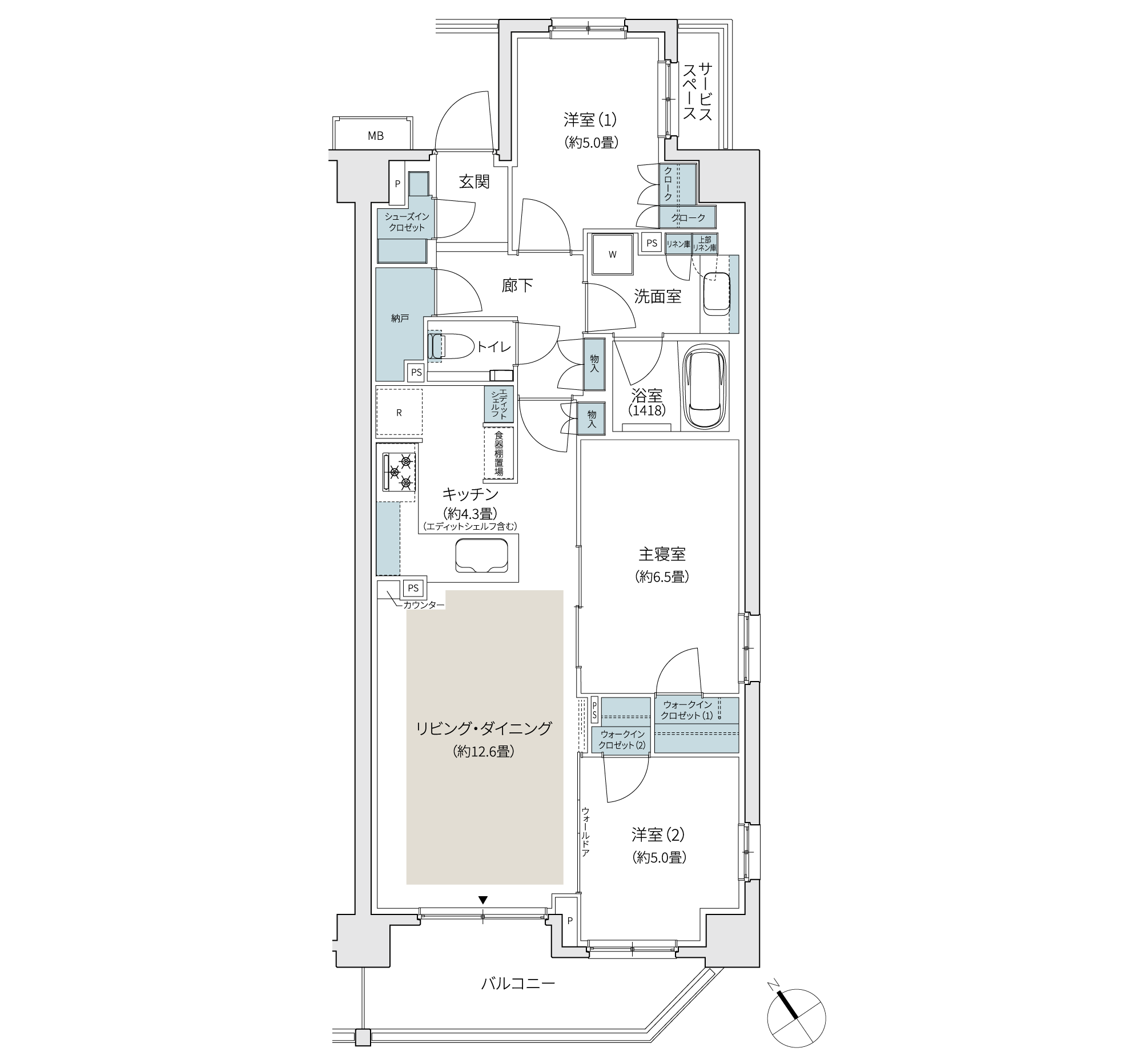 H-TYPE 3LDK+2WIC+SIC+N 専有面積:77.40㎡(約23.41坪) 3方向に開口のある南向きの角住戸 柱が無く家具を配置しやすい、約6.5畳の広々主寝室 プラントップに戻る ※WIC:ウォークインクロゼット SIC:シューズインクロゼット N:納戸 ※掲載の図面は設計段階の図面を基に描いたもので実際とは異なります。また施工上の理由及び改良等により変更となる場合がございます。 ※住戸により仕様・形状が異なる場合がございます。