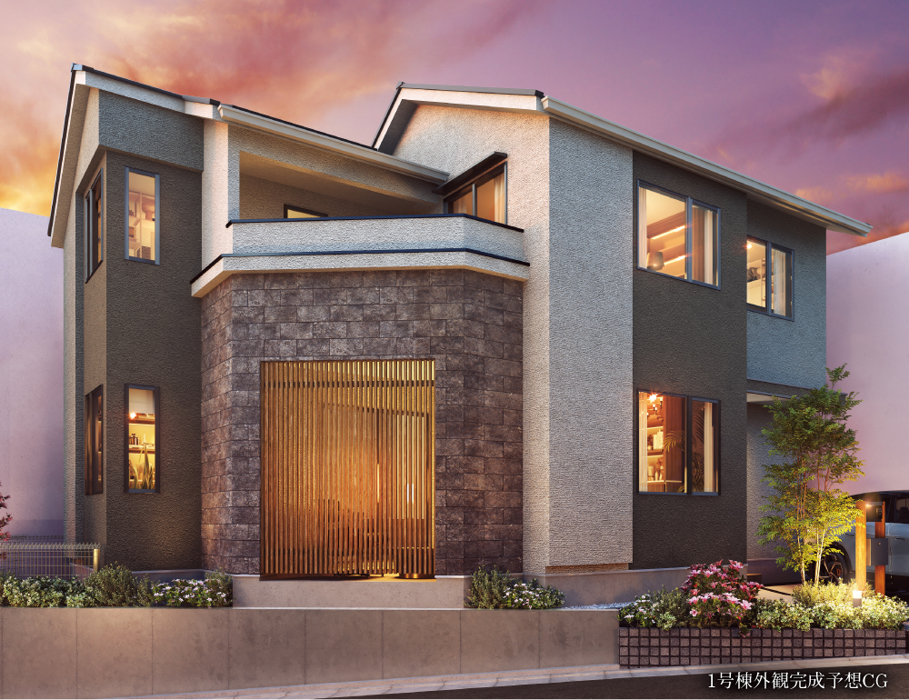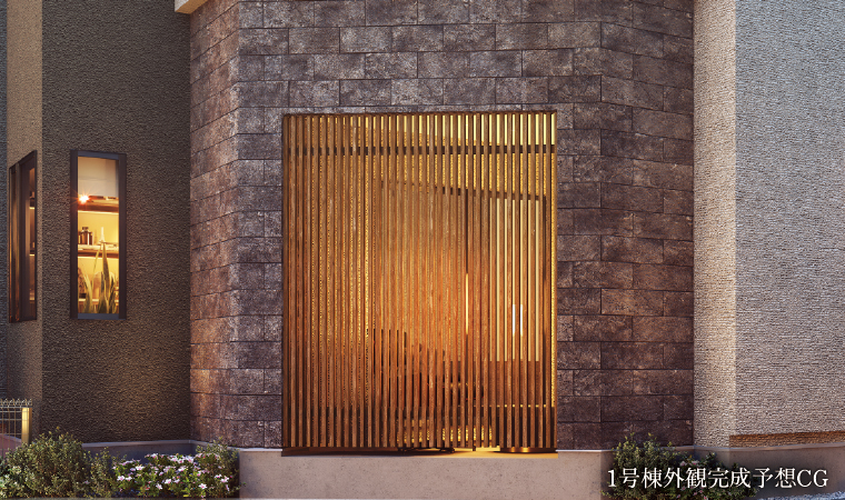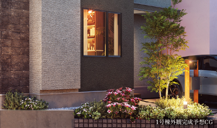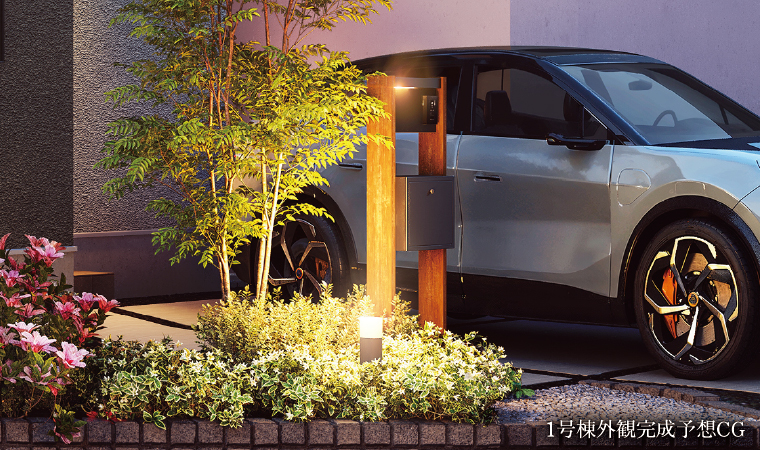 ※掲載の完成予想CGは設計図を基に作成したもので形状・色等は実際とは異なります。外観形状の細部・設備 機器等は表現しておりません。 表現されている植栽は竣工から初期の育成期間を経た状態のものを想定して描 いております。竣工時は植物の生育を見込んで必要な間隔をとって植えております。家具・調度品等は販売価格 に含まれません。