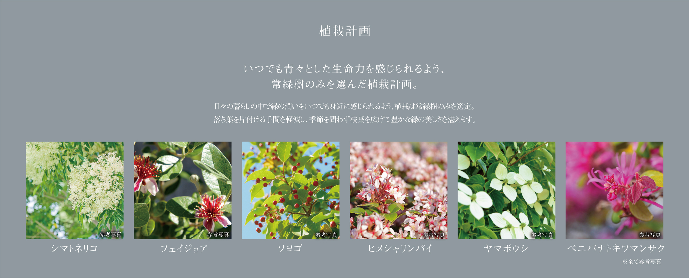 ※掲載の植栽写真はイメージであり、計画段階の樹種から一部を抜粋して掲載しています。実際とは異なる場合 や今後変更となる場合があるほか、お引渡し時点では写真ほど成長していない場合があります。