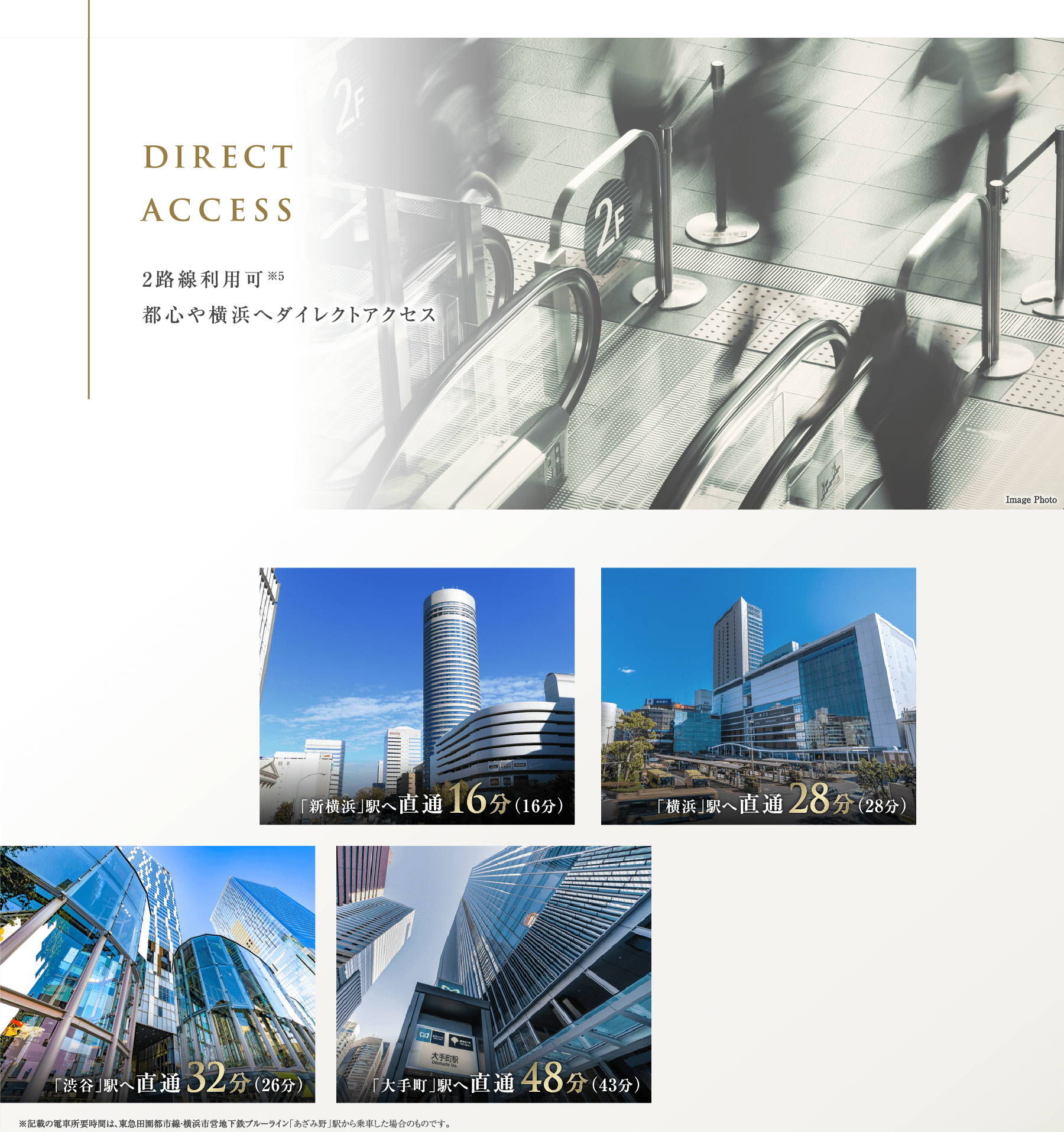 ※掲載の所要時間は、横浜市営地下鉄ブルーライン「あざみ野」駅より「新横浜」駅:横浜市営地下鉄ブルーライン利用(日中時も同経路)、「横浜」駅:横浜市営地下鉄ブルーライン利用(日中時も同経路)。東急田園都市線「あざみ野」駅より「渋谷」駅:東急田園都市線準急利用(日中時も同経路)、「大手町」駅:東急田園都市線急行利用(日中時:東急田園都市線準急利用)を利用した場合のもので、通勤時<7:30〜9:00>の目的地へ到達する最多の所要時間です。乗り換え、待ち時間等を含みます。( )は平日日中<11:00〜16:00>となります。