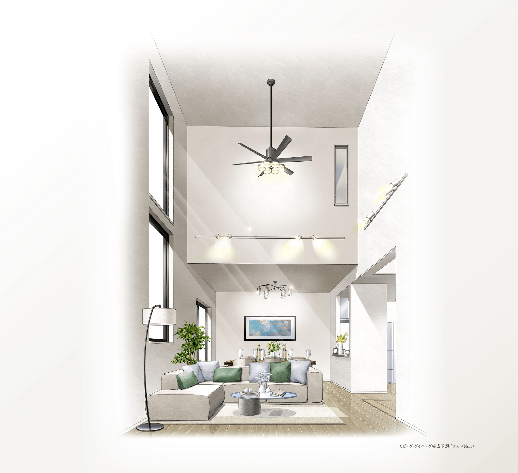 ※掲載のイラスト・完成予想CGは設計図を基に作成したもので、形状・色等は実際とは異なります。外観形状の細部・設備機器等は表現しておりません。表現されている植栽は施工から初期の育成期間を経た状態のものを想定して描いております。施工時は植物の育成を見込んで必要な間隔をとって植えております。家具・調度品は販売価格に含まれません。予めご了承ください。