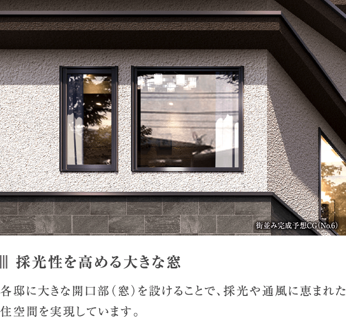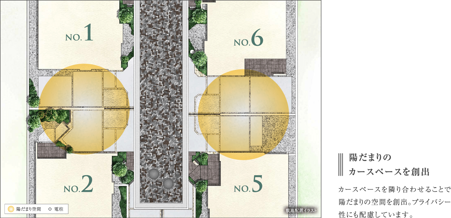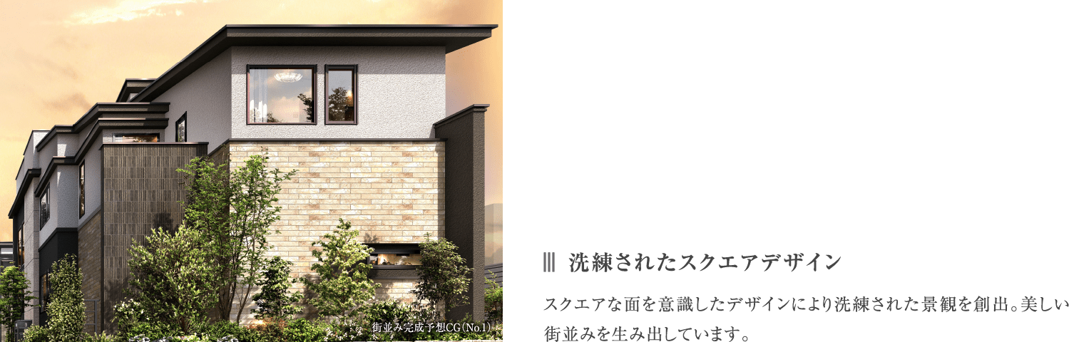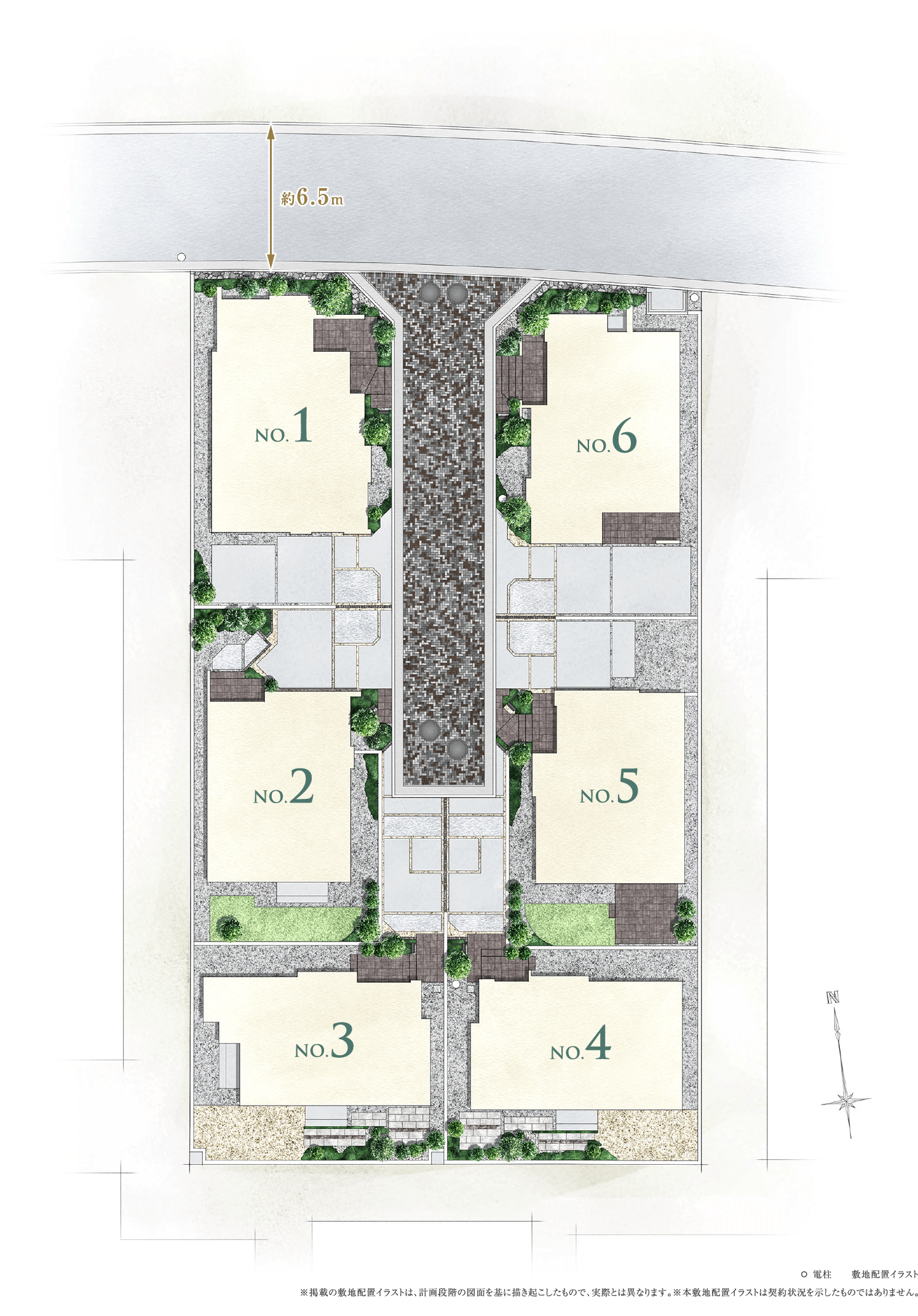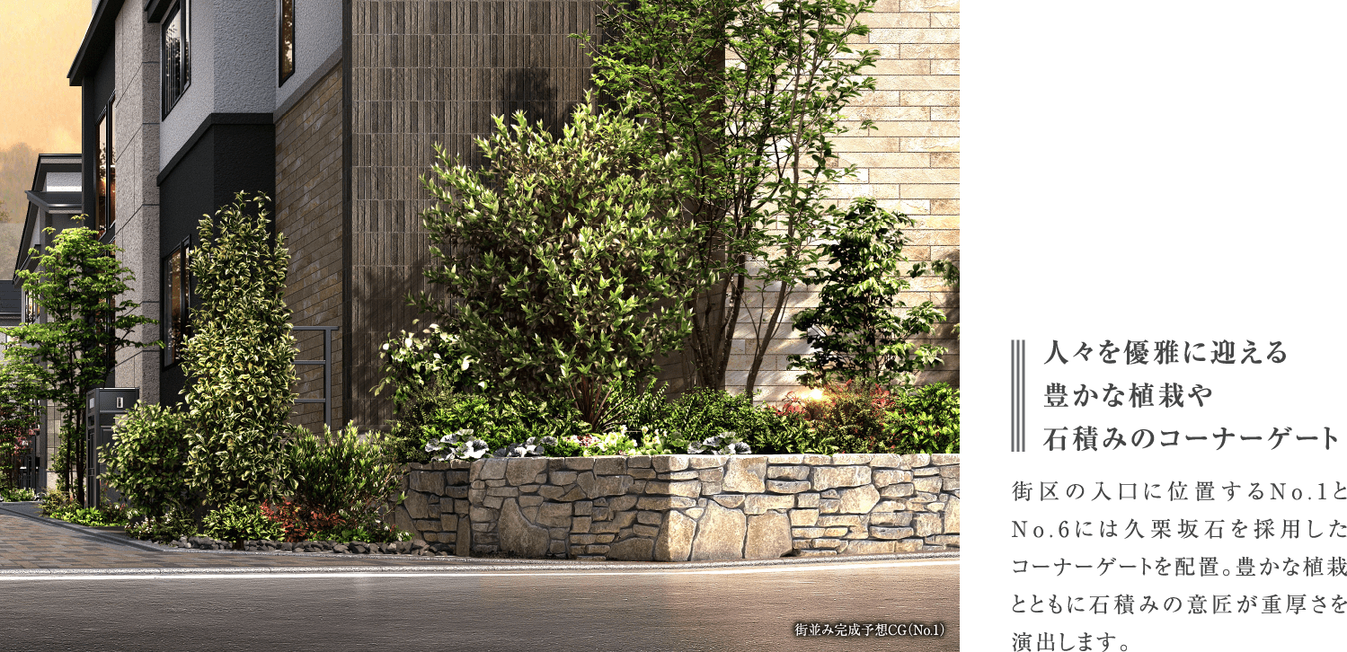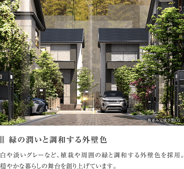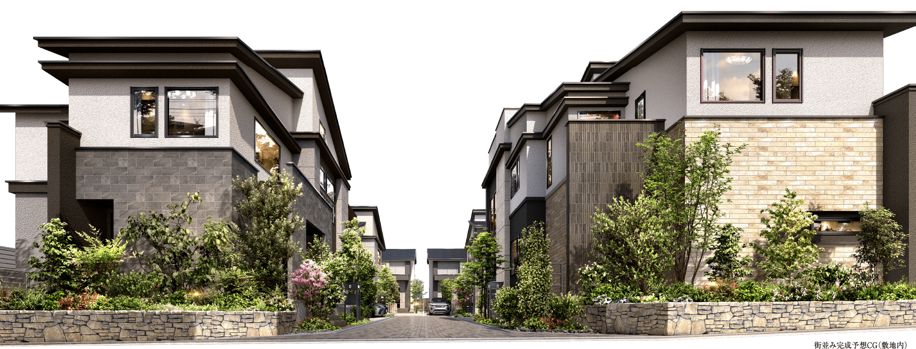 ※掲載の街並み完成予想CG(敷地内)は設計図を基に作成したもので、形状・色等は実際とは異なります。外観形状の細部・設備機器等は表現しておりません。表現されている植栽は施工から初期の育成期間を経た状態のものを想定して描いております。施工時は植物の育成を見込んで必要な間隔をとって植えております。家具・調度品は販売価格に含まれません。予めご了承ください。また、本物件の開発敷地内のみを表示しています。