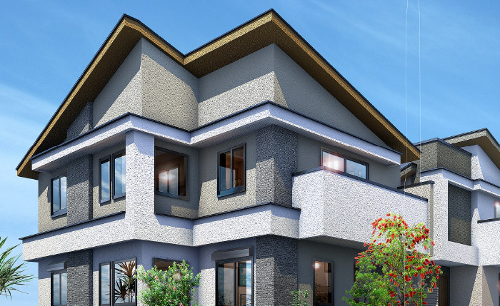 片流れ屋根や複数素材の組み合わせにより、洗練されたモダンなイメージとともに、街並みの統一感の中にも個性と躍動感をデザインしました。