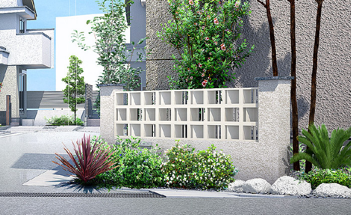 琉球石灰岩や有孔ブロックなどを採用したコーナーウォールが、開放感あふれるリゾート感を演出します。