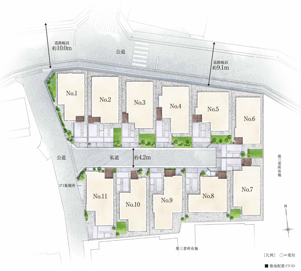 ※掲載の完成予想CG・敷地配置図イラストは、設計図を基に作成したもので、形状・色等は実際とは異なります。なお、外観形状の細部、設備機器等は表現しておりません。このCGで表現されている植栽は竣工から初期の育成期間を経た状態のものを想定して描いており、竣工時は植物の生育を見込んで必要な間隔をとって植えております。※家具・調度品等は販売価格に含まれません。※本敷地配置イラストは契約状況を表示したものではありません。