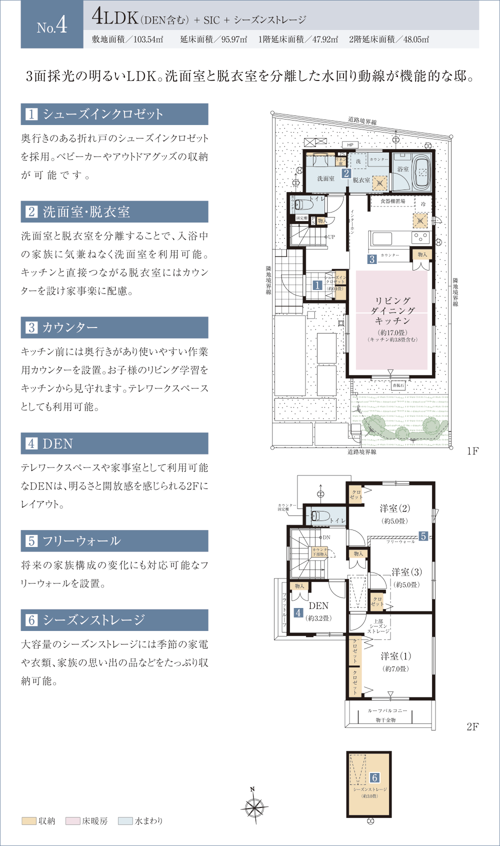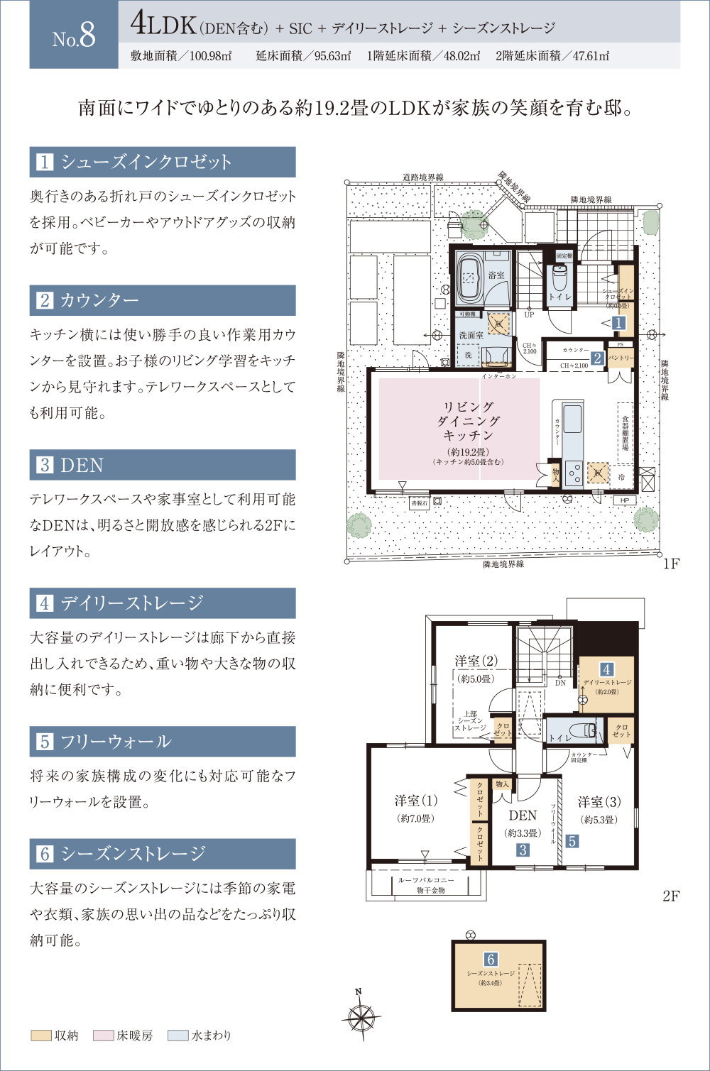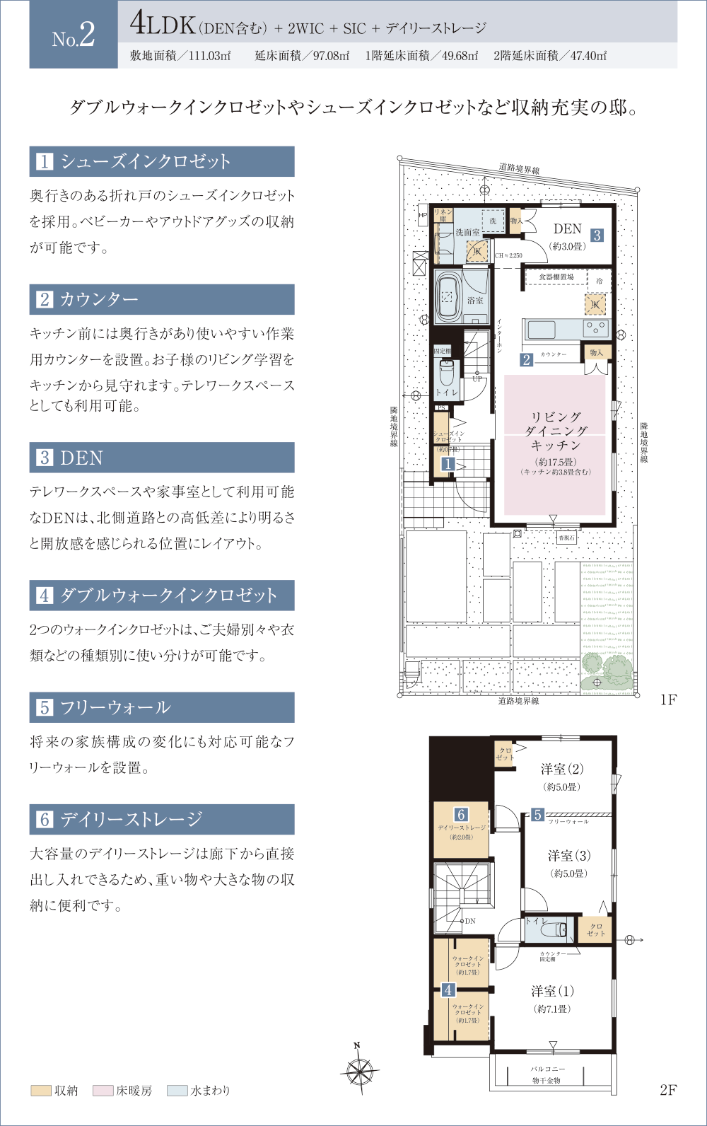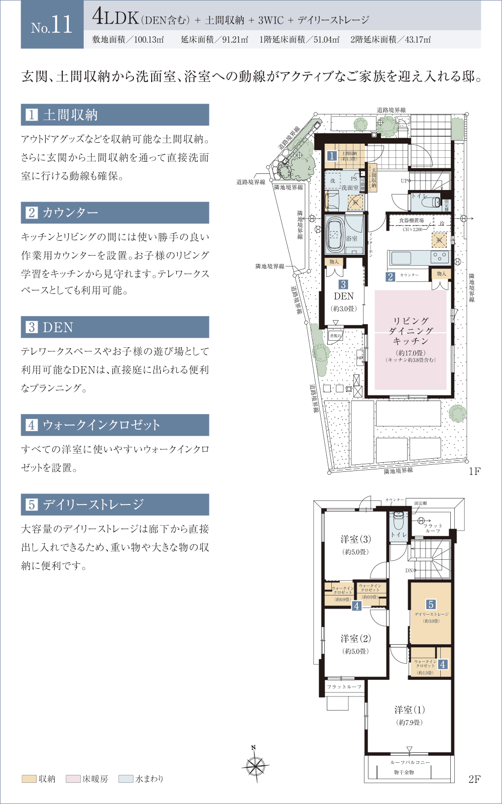 ※DEN=書斎 ※WIC=ウォークインクロゼット ※SIC=シューズインクロゼット ※デイリーストレージ=下屋裏収納 ※シーズンストレージの畳数には収納ハシゴを含みます。