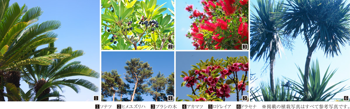 ソテツやドラセナなど南国由来の樹種を一部に採用して、海辺のリゾート空間を創出しています。