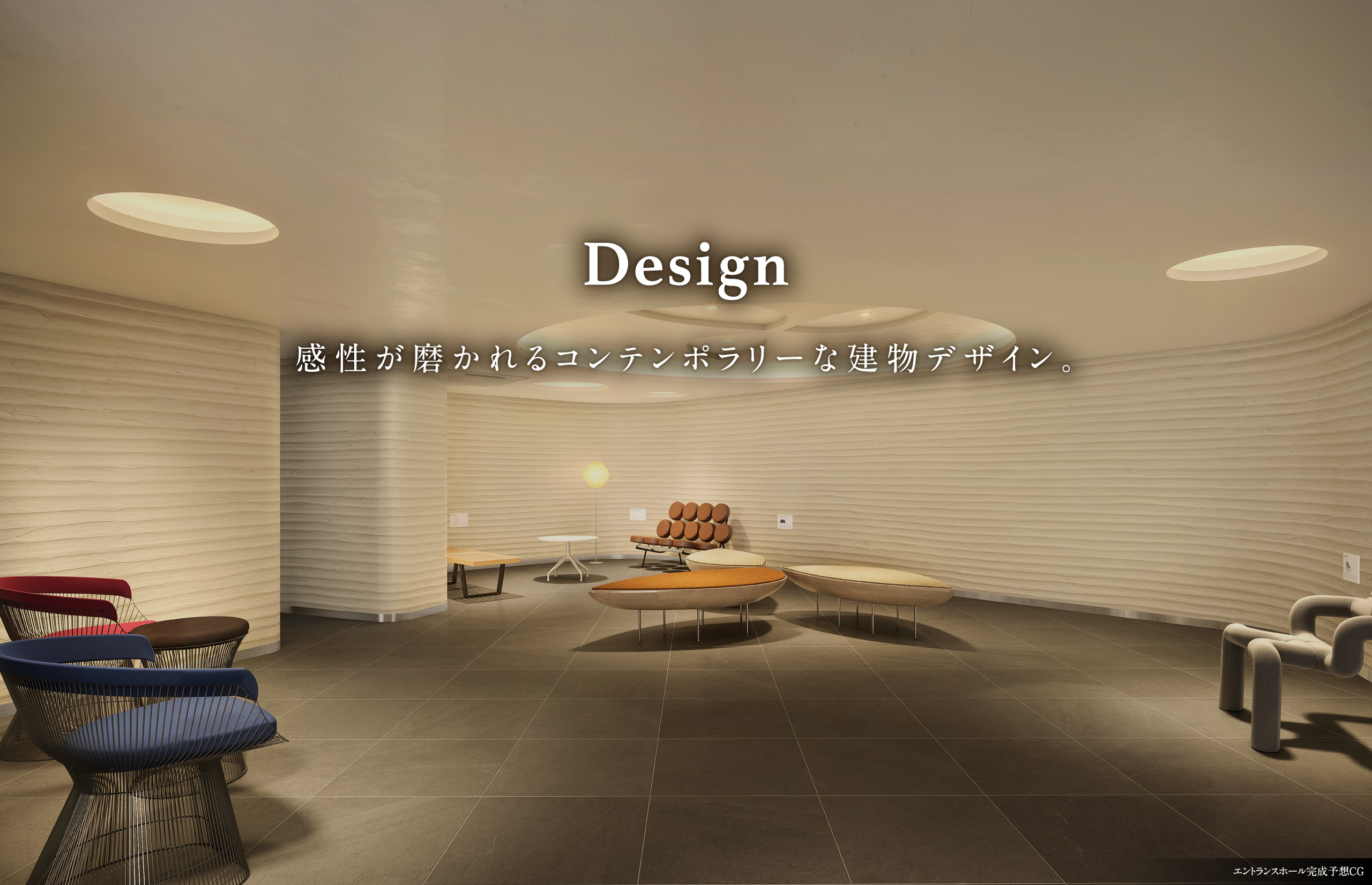 白を基調とした静謐な空気を纏うエントランスホールには、色調や形状が異なる個性的なチェアをギャラリーのように配置。折上天井の柔らかな間接照明とアートがくらしの入口に彩りを与えます。