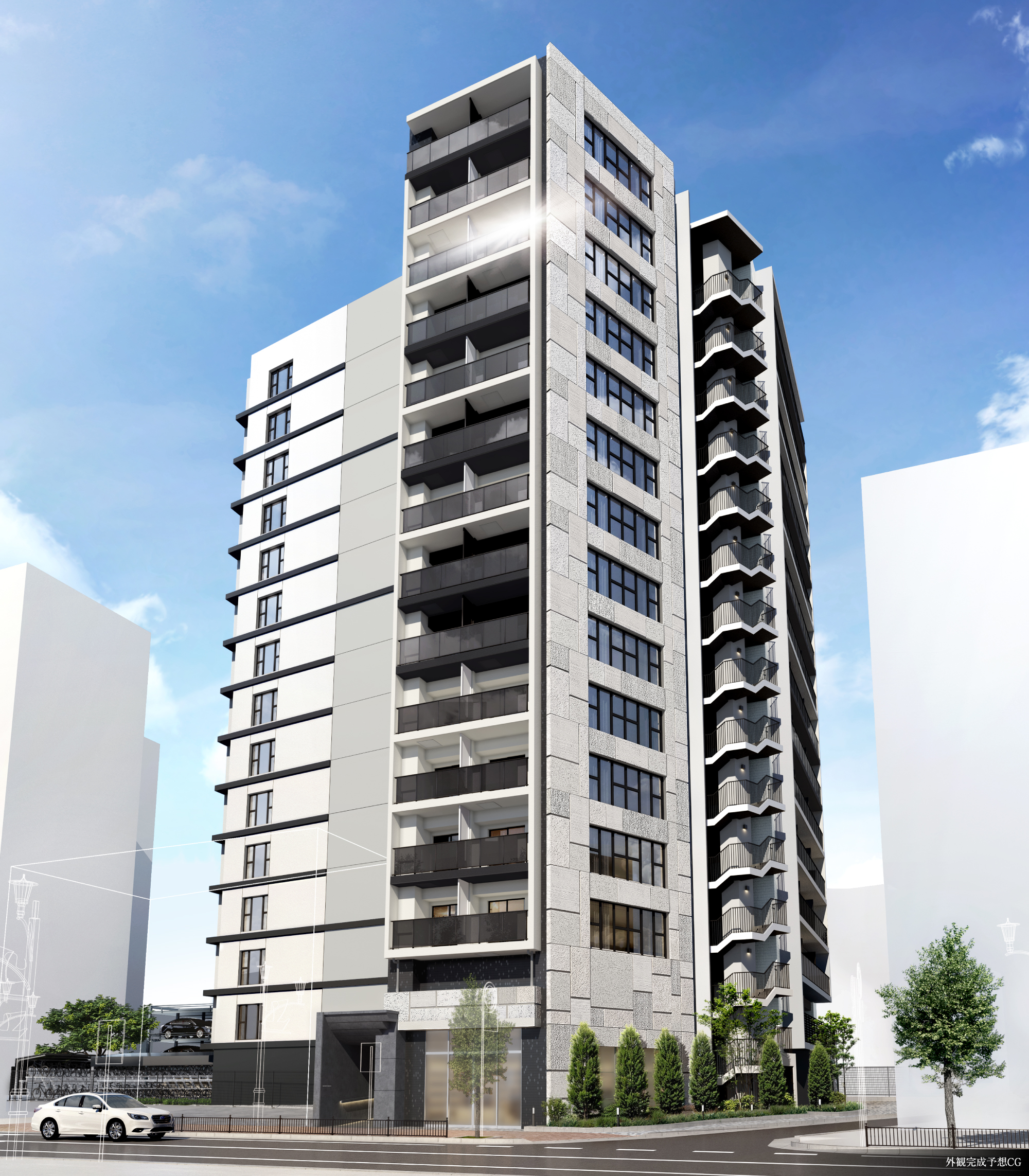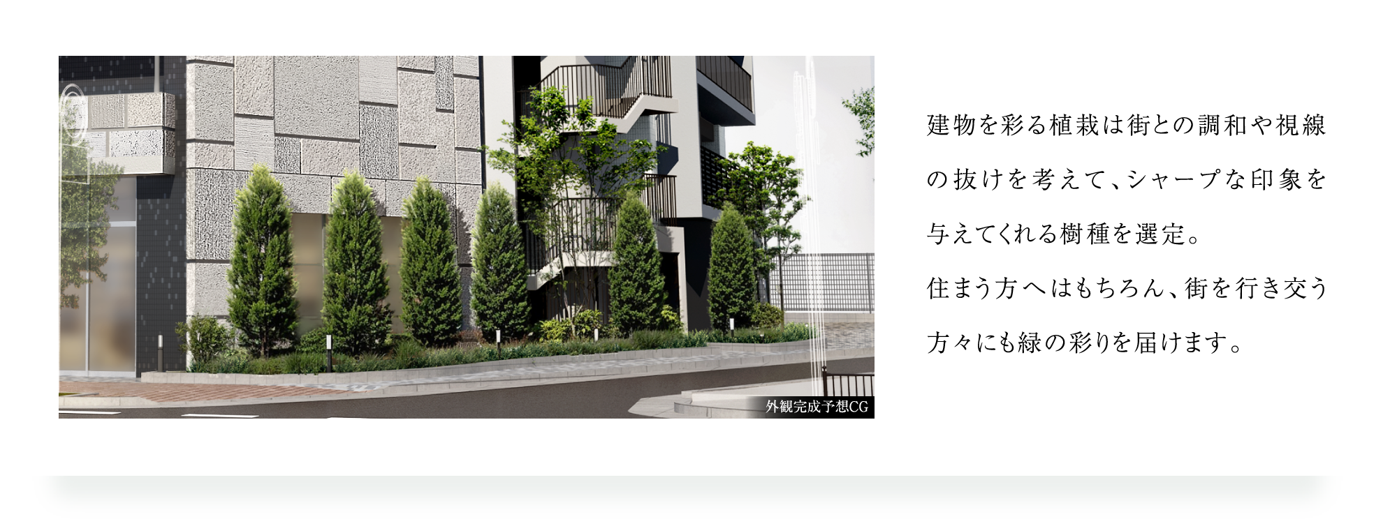 ※掲載の完成予想CGは図面を基に描き起こしたもので、形状・色等は実際とは異なります。外観形状の細部・設備機器等は表現しておりません。表現されている植栽は竣工から初期の育成期間を経た状態のものを想定して描いており、竣工時は植物の生育を見込んで必要な間隔をとって植えております。施工上の都合により、設定位置・樹高・本数等変更になる場合があります。共用部の使用は管理規約に従っていただきます。