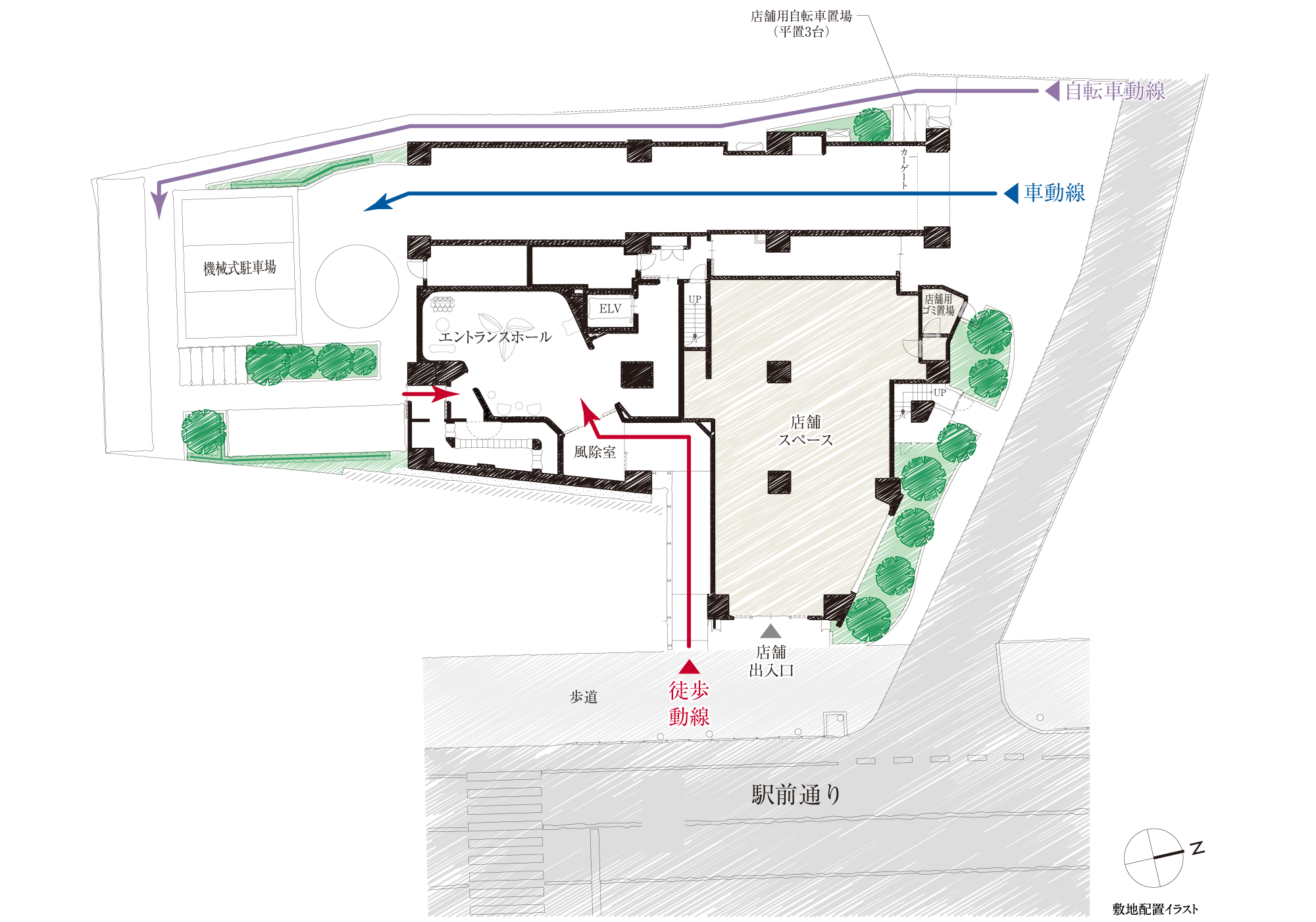 敷地計画は、住まう方はもちろんのこと、街を行き交う方の動線も考慮しながら、