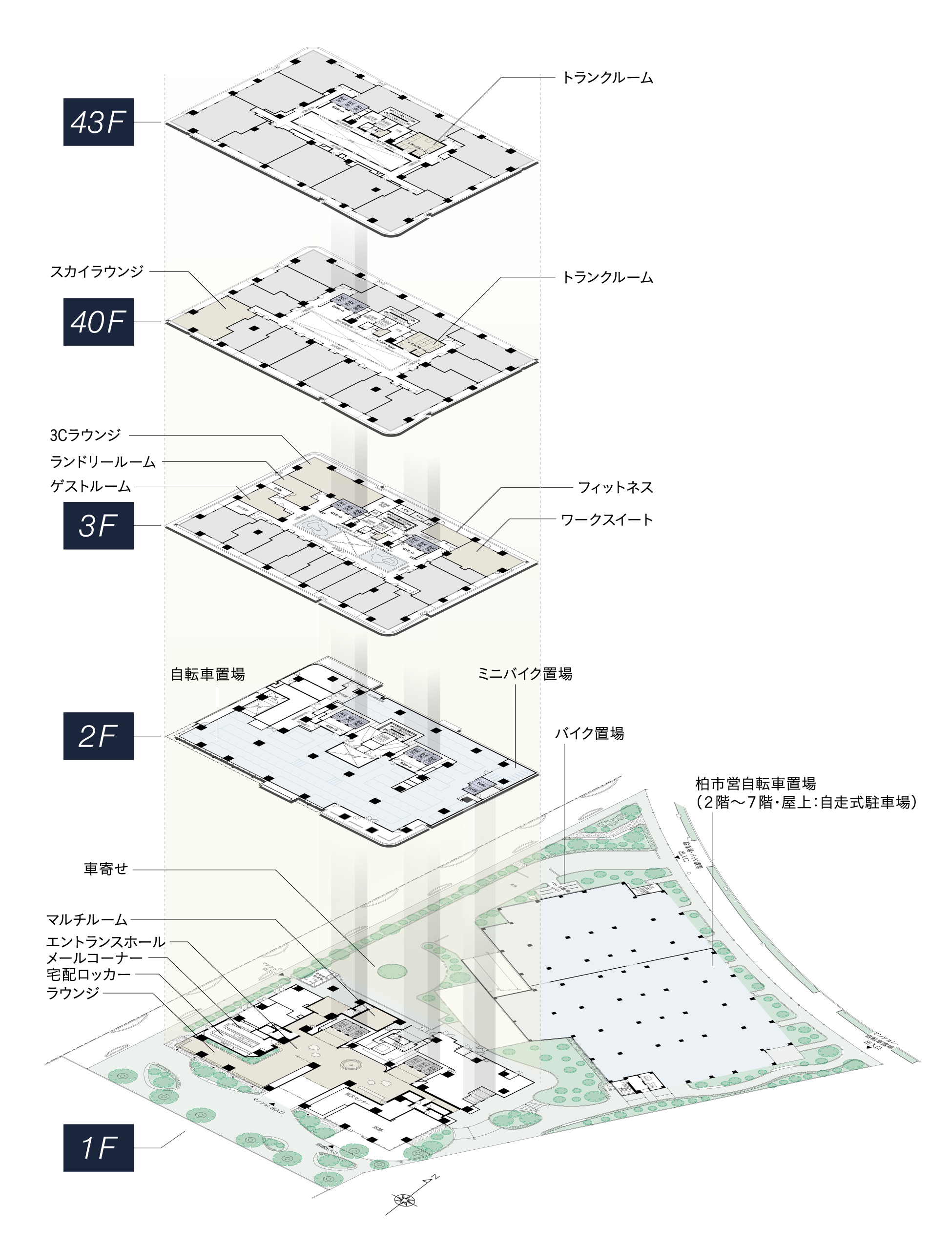 ※掲載の完成予想CGは計画段階の図面を基に描いたもので建物の形状・色等は実際とは異なります。なお形状の細部、設備機器等は表現しておりません。※表現されている植栽は初期の育成期間を経た状態のものを想定して描いており、竣工時は植物の育成を見込んで必要な間隔をとって植えております。施工上の都合により、設定位置・樹高・本数等変更となる場合があります。※周辺の道路・建物などについては一部簡略化しており、実際とは異なります。※スカイラウンジ完成予想CGの眺望写真は現地40階相当の高さ(約140m)から撮影(2024年11月)したもので、実際の眺望とは異なります。眺望・景観は、今後の周辺環境の変化に伴い将来にわたって保証されるものではありません。※共用部の家具・調度品・アート作品等は変更となる場合がございます。また、一部施設およびサービスのご利用は予約制・有料となります。共用施設のご利用は管理規約等に従っていただきます。※1.週5日勤務(木~月曜)9:00-18:00(休憩時間1時間含む)。※夏季休暇・年末年始休暇あり。コンシェルジュサービスのご利用には一部有料およびご予約が必要なものがございます。サービス内容は変更となる場合があります。詳しくは係員にお尋ねください。※2.24時間ごみ出しは可能です。粗大ごみは除きます。※ペットの飼育は管理規約に従っていただきます。