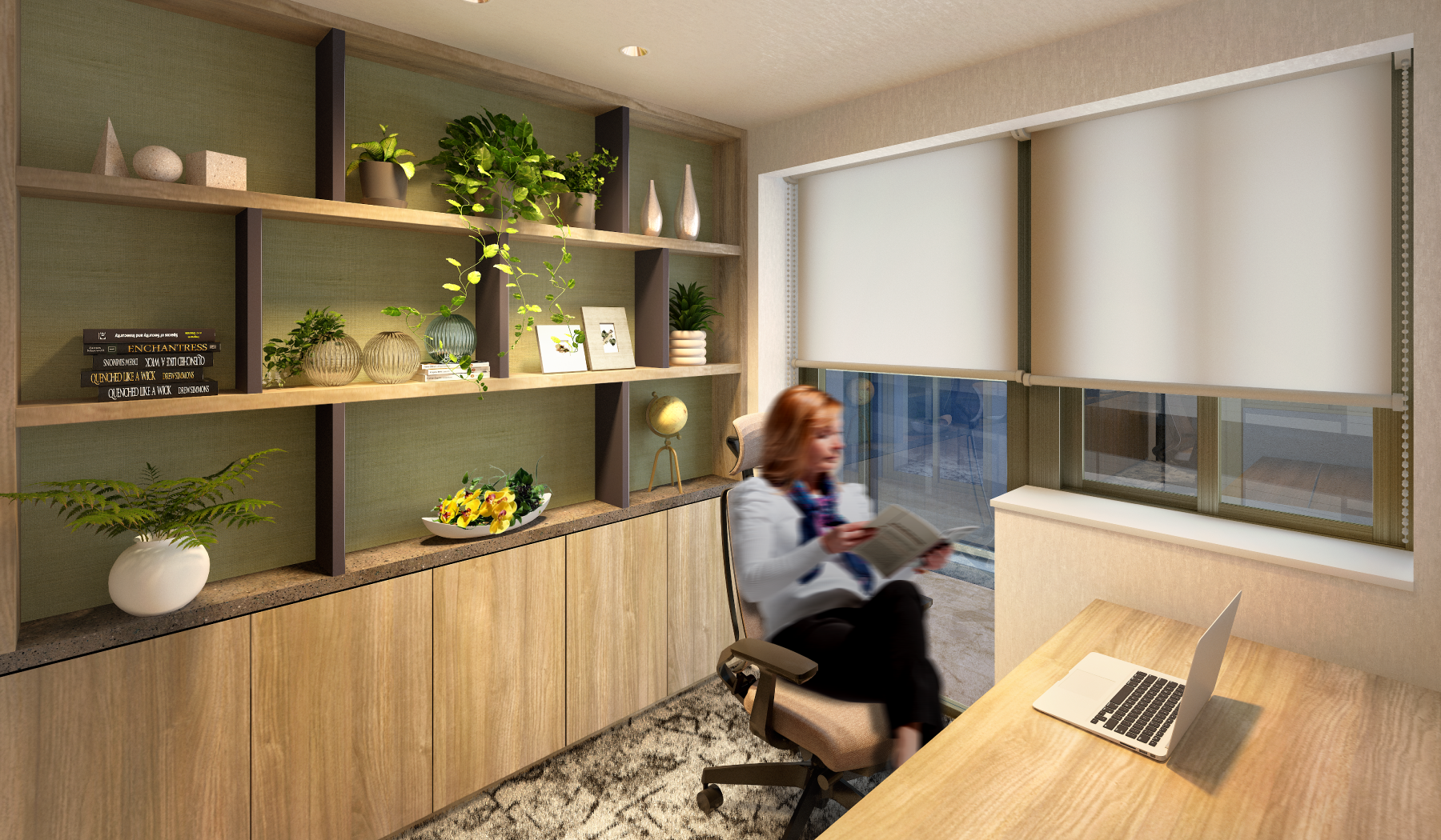 緑を引き込み、天井には木目調ルーバーをあしらい、