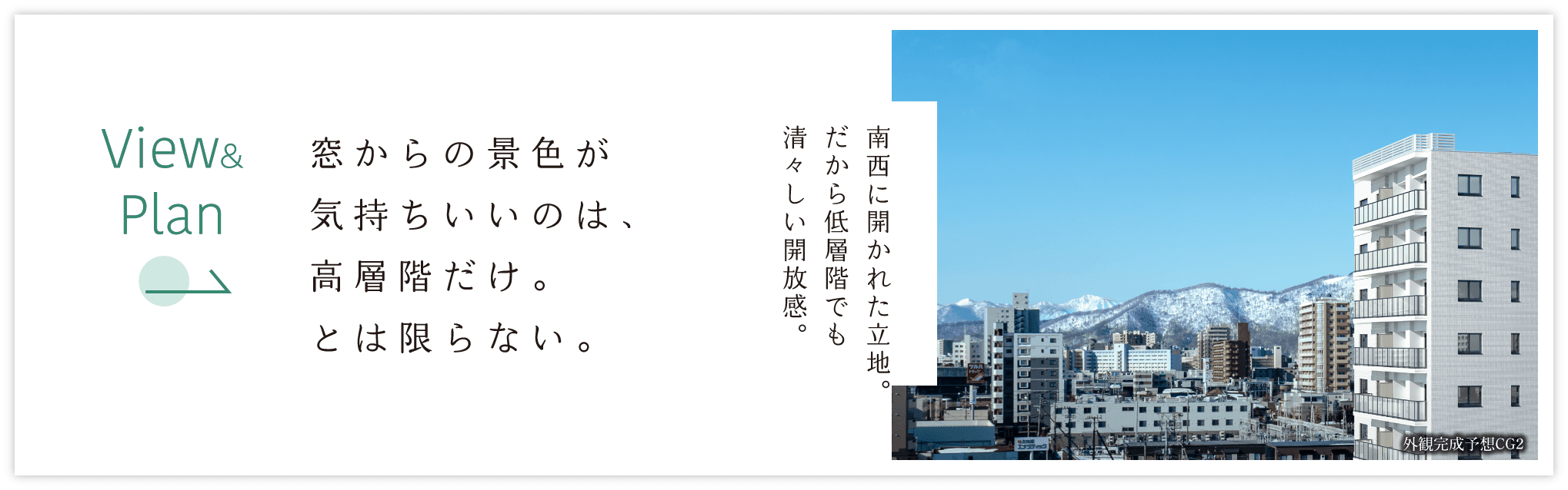 ※掲載の外観完成予想CG2は計画段階の図面を基に描き起こしたもので、形状・色等は実際とは異なります。現地8階相当の高さ(約22m)から南西方面を撮影(2025年3月)した眺望写真にCGを合成したものです。実際の住戸からの眺望とは異なります。眺望・景観は、各階・各住戸により異なり、今後の周辺環境の変化に伴い将来にわたって保証されるものではありません。なお、形状の細部、設備機器等は表現しておりません。