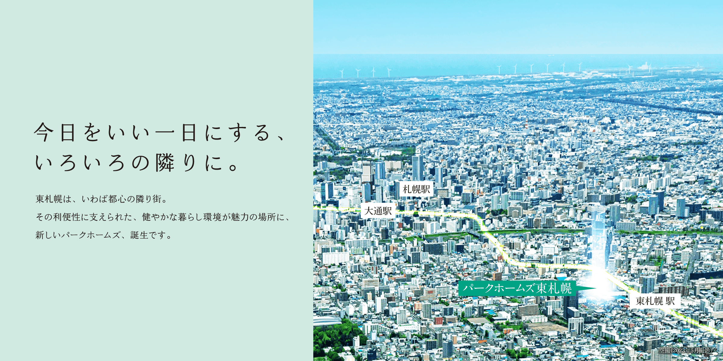 ※掲載の空撮は、2023年5月に撮影したものに光等CG処理を加えたもので、実際とは異なります。現地の位置を表現した光は建物の高さや規模を示すものではありません。