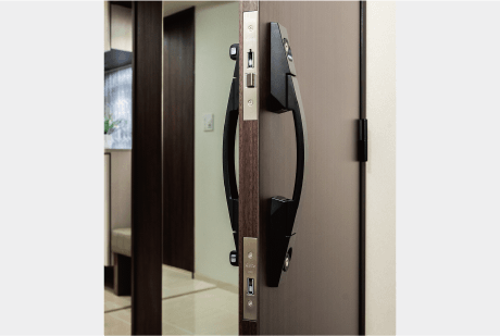 風除室とエントランスホールにオートロックシステムを採用し、玄関前まで3段階の強固なセキュリティを構築しました。オートロック操作盤にはカメラを設置しているため、住戸内から来訪者を音声と映像で確認できます。さらにオートロックにはハンズフリーシステムと非接触システムを導入。防犯性だけでなく快適性も高めています。